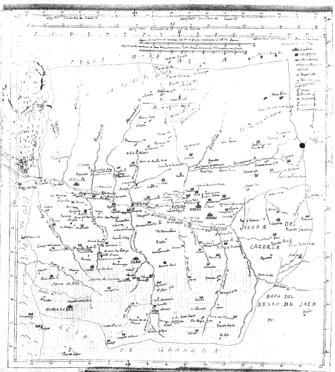 | 500 | ## | $aMeridiano de Madrid, Isla de Hierro y Pico de Tenerife | 500 | ## | $aEs una minuta y se encuentra entelado junto al grabado que es el registro 80 | 500 | ## | $aOtras escalas gráficas 10 leguas legales castellanas de las cuales 20 1/2 componen un grado [= 9,8 cm] | 500 | ## | $aMinuta preparatoria del mapa del reino de Jaén publicado por Tomás López en 1761. Al compararla con un ejemplar del mapa estampado se hacen patentes algunos de los procedimientos empleados en el proceso que llevaba del dibujo al impreso, como la cuadrícula que, además de facilitar la composición, servía para trasladarlo a la plancha del grabado | 500 | ## | $aRespecto a la topografía representada, es de notar la configuración del área de paso entre La Mancha y Andalucía por Sierra Morena, donde los lugares habitados y topónimos todavía se remiten al estado anterior al establecimiento de las Nuevas Poblaciones de La Carolina, Santa Elena, Carboneros, Guarromán y otras, cuya fundación se llevaría a cabo pocos años después, a finales de la década de 1760. Asimismo se contempla la ausencia del sector de la sierra de Segura, perteneciente a Murcia hasta la organización de las provincias modernas en 1833 |