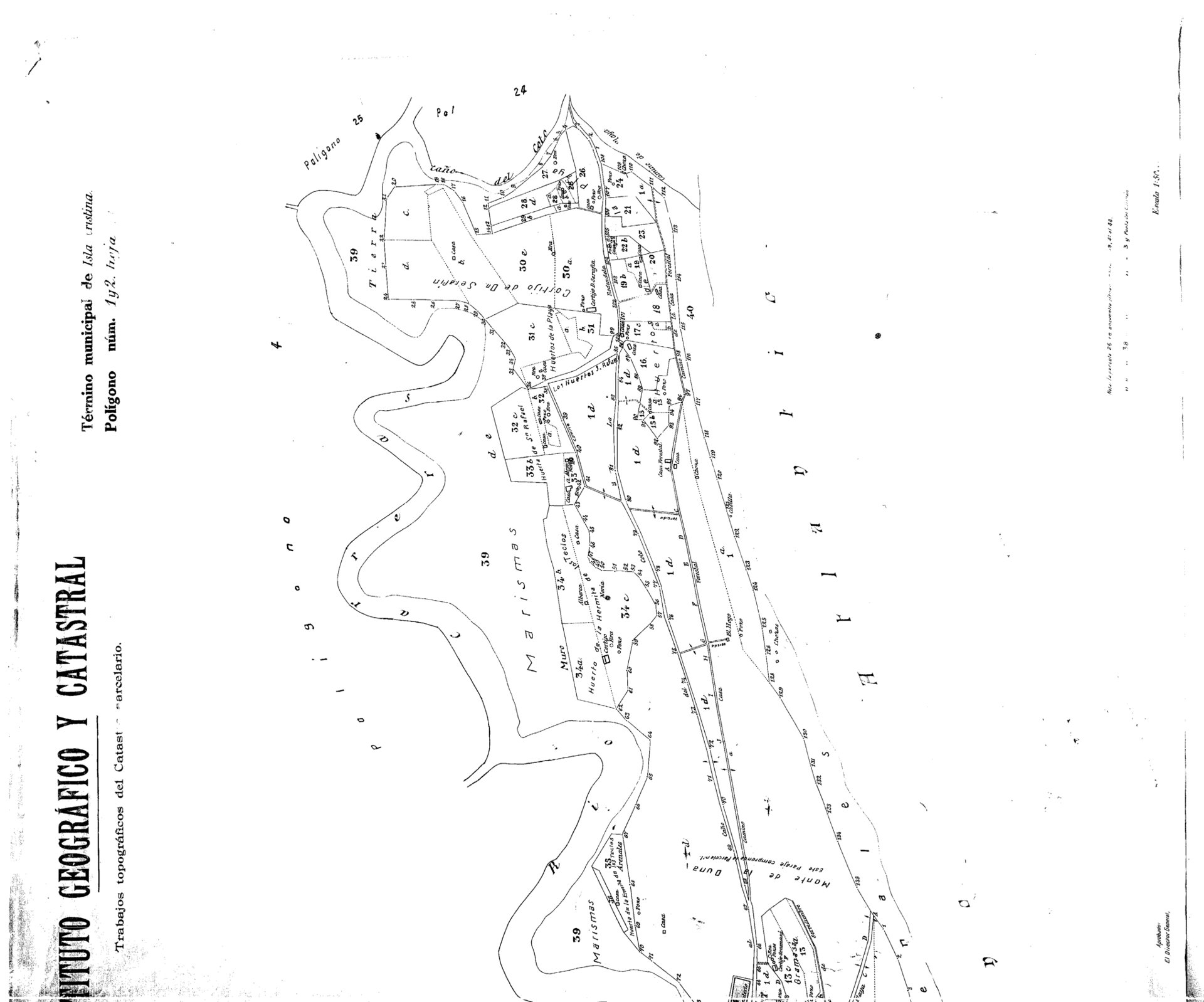 | 245 | ## | $aTrabajos topográficos del Catastro parcelario. Término Municipal de Isla Cristina$bPartido Judicial de Isla Cristina$cInstituto Geográfico y Catastral ; José María de la Puente y López, Ingeniero Geógrafo Jefe de la Brigada Topográfica de Parcelación de la provincia de Huelva$h[Material cartográfico]$nPolígono núm. 1 |