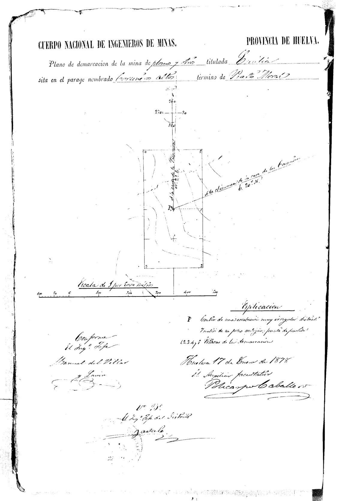 | 245 | ## | $aPlano de demarcación de la mina de plomo y otros titulada Emilia sita en el paraje nombrado Coruñero término de Puerto Moral |
