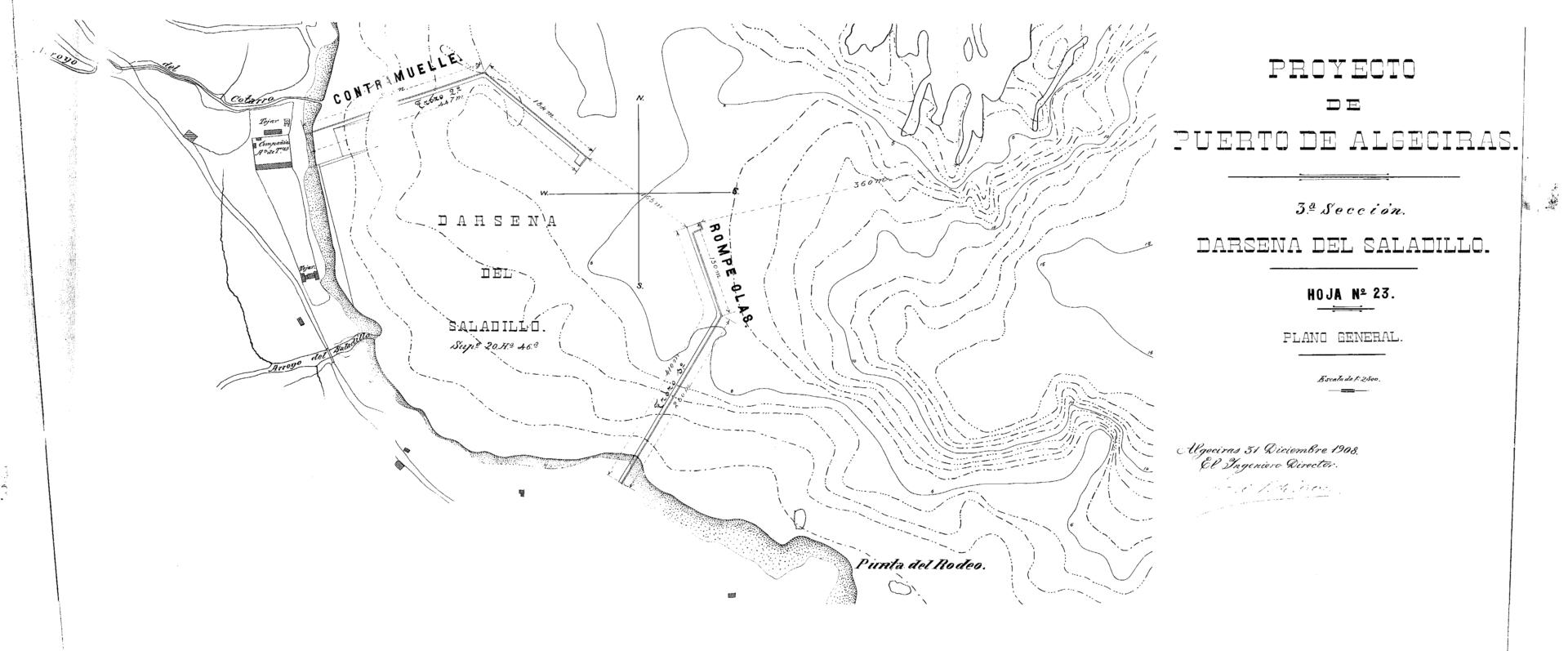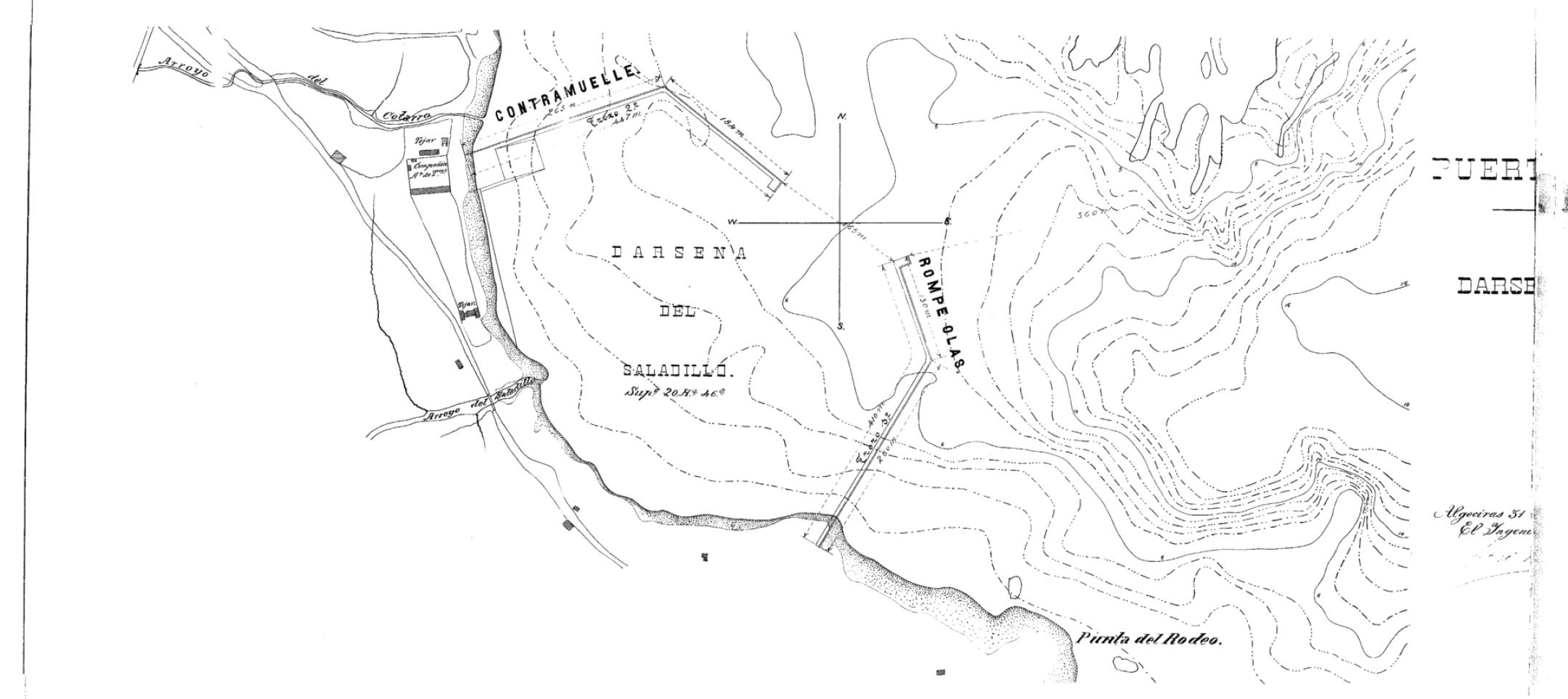 | 500 | ## | $aJose R de Rivera JOP se incluye en el anexo cartográfico del Proyecto de Puerto de refugio en Algeciras n4 1908 | 500 | ## | $aAlgeciras 31 diciembre 1908 el Ingeniero Director Jose R de Rivera | 500 | ## | $aOrientado con dos líneas perpendiculares al N,S,E y O | 500 | ## | $aEstado regular con humedad y rotura |
