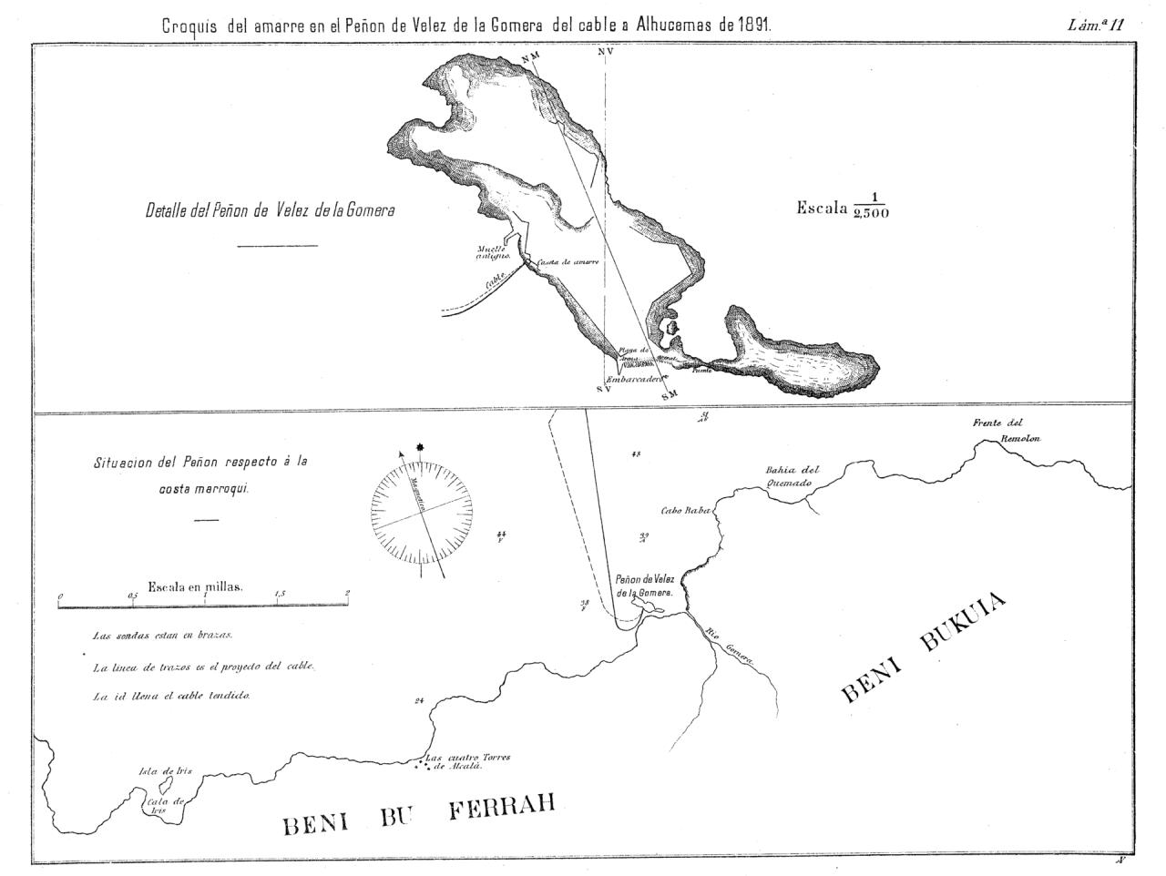 | 500 | ## | $aOrientado con flecha y rosa de los vientos, indicando el N. magnético y el real | 500 | ## | $aInserta : "Detalle del Peñon de Velez de la Gomera". Escala 1:2500. Orografía por normales | 500 | ## | $aPresenta la situación del Peñón respecto a la costa marroquí | 500 | ## | $aNota explicativa para indicar que la línea continua señala los cables tendidos, y la de trazos, los proyectados | 500 | ## | $aIndica los cables que van desde el Peñón hasta Alhucemas | 500 | ## | $aSeñala sondas expresadas en brazas | 500 | ## | $aEn el ángulo superior derecho : "Lám. 11 | 500 | ## | $aExisten 5 ejemplares |