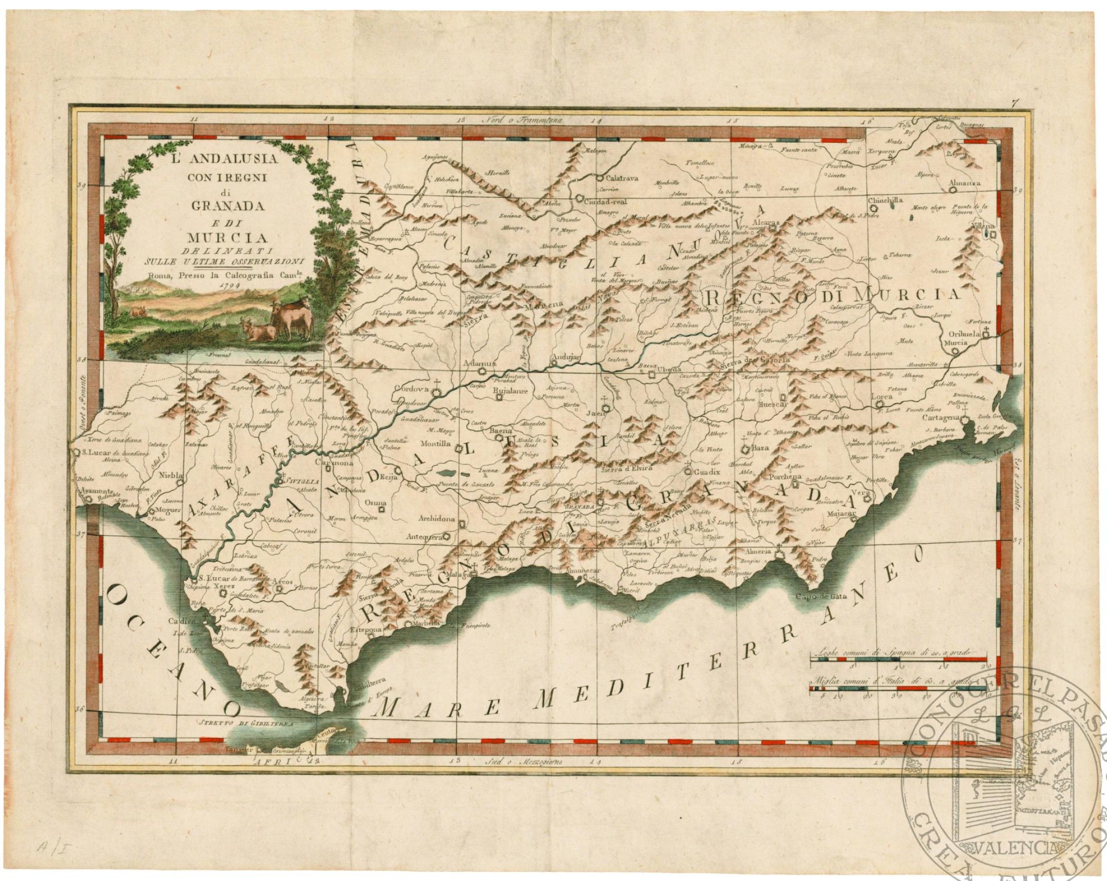 | 500 | ## | $aEscala gráfica también expresada en 60 Miglia comuni d' Italia di 60. a grado. Coordenadas referidas a un meridiano que no se especifica (E10°20'--E16°55'/N39°18'--N35°50'). Red geográfica de 1° en 1°. Mención nominal de los puntos cardinales. Márgenes graduados | 500 | ## | $aOrografía de perfil | 500 | ## | $aComprende Andalucía, Murcia y las zonas limítrofes de las provincias adyacentes (Badajoz, Ciudad Real, Albacete y Alicante) | 500 | ## | $aLímites de los antiguos reinos diferenciados por color | 500 | ## | $aColoreado a mano | 500 | ## | $aTítulo y pie de imprenta enmarcados en paisaje campestre, con animales representativos de la zona (toros y conejo) en primer plano | 500 | ## | $aEn : Cassini, Giovanni María : "Nuovo Atlante Geografico Universale". Roma : Calcografia Camerale, 1792-1801. Tomo II, h. 7 | 500 | ## | $aOtro de los varios mapas de Andalucía de procedencia italiana publicados entre fines del siglo XVIII y principios del XIX, cuando la producción cartográfica sobre la región andaluza se reparte entre los talleres de varios países, a diferencia de su acusada concentración en unos pocos focos en fechas anteriores | 500 | ## | $aCon una composición y contenidos por entero convencionales que recuerdan al mapa de Andalucía del francés R. Bonne con leves rectificaciones, se debe al artista y cartógrafo Giovanni Maria Cassini. Éste se hizo cargo de la edición y ejecución del "Nuovo atlante geografico universale..." publicado en Roma por la Calcografía Camerale en tres tomos sucesivos entre 1792 y 1801, una extensa recopilación con elaborados grabados de cuidada estampación que volvió a dar brío a la arraigada tradición cartográfica de la capital romana. El mapa de Andalucía figuró como la hoja 7 del tomo II de esta obra, tomo que salió a la luz en 1797 con 70 mapas a doble página |