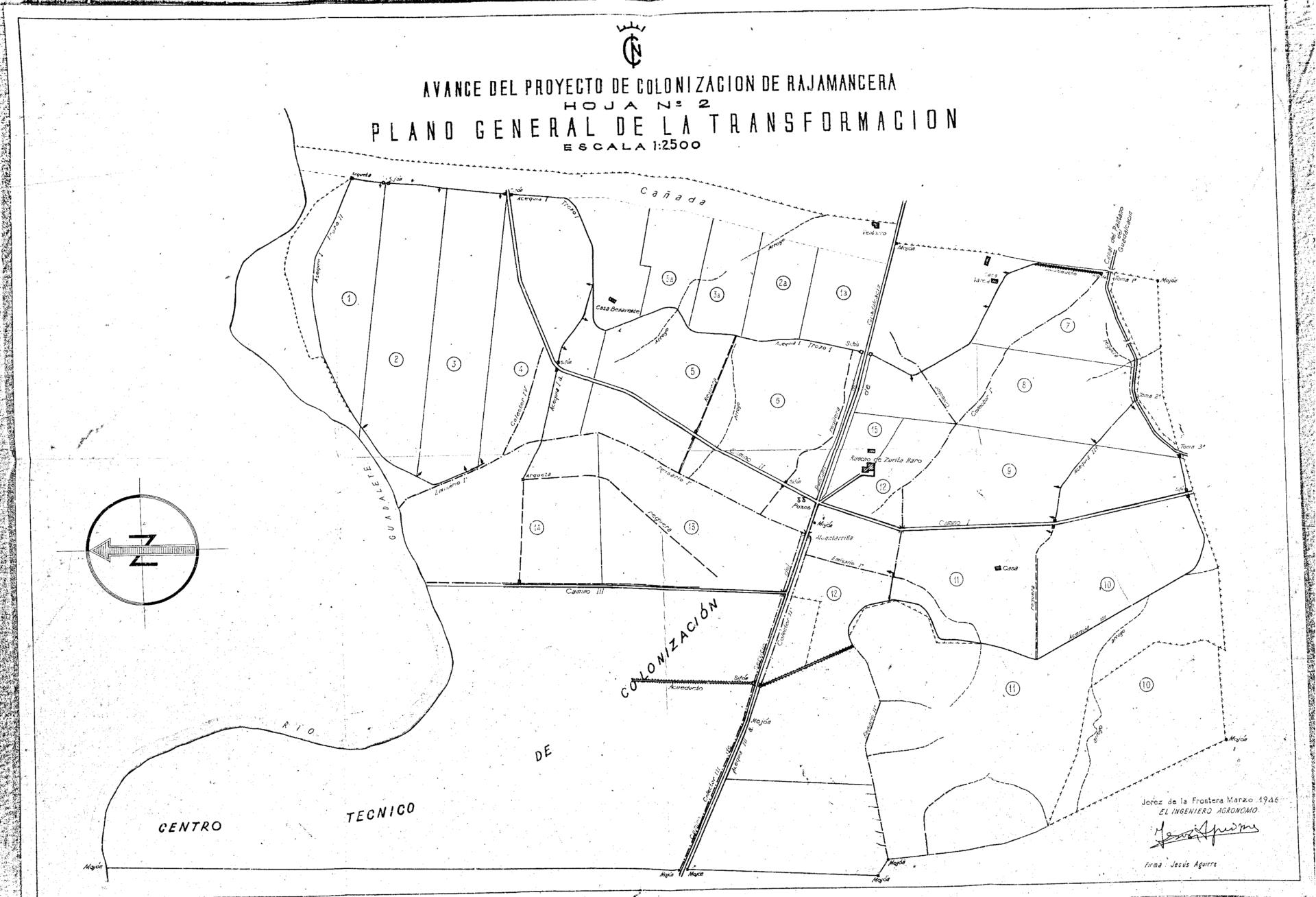 | 500 | ## | $aOrientado con flecha | 500 | ## | $aFechado y firmado en Jerez de la Frontera, por el autor | 500 | ## | $aSeñala la parcelación del suelo y el emplazamiento del Centro Técnico de Colonización, así como la red de acequias, desagües y caminos proyectados | 500 | ## | $aFotocopia azográfica, coloreada a mano | 500 | ## | $aEn : Instituto Nacional de Colonización : "Avance del proyecto de colonización de la finca Rajamancera". 1946. Planos. N. 2 |