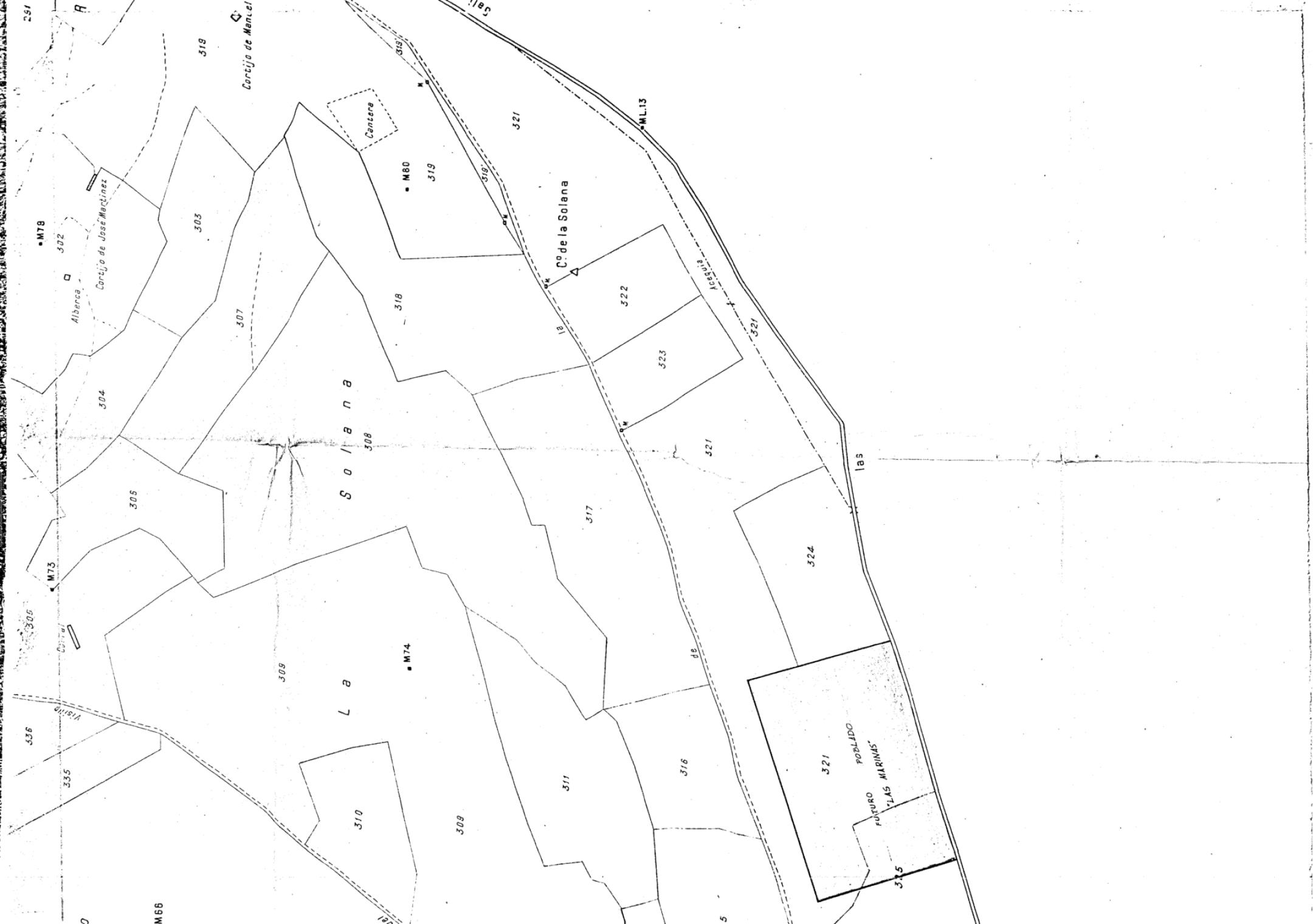 | 500 | ## | $aEscala también expresada en forma gráfica de 500 metros. Orientado con flecha | 500 | ## | $aComprende la parte del término municipal de Roquetas de Mar que se extiende entre el camino de Roquetas a la Solera y la carretera de las Salinas | 500 | ## | $aDiferencia por color el emplazamiento del futuro poblado de Las Marinas | 500 | ## | $aFotocopia azográfica coloreada a mano | 500 | ## | $aEn : Instituto Nacional de Colonización : "Propuesta de ocupación de los terrenos del emplazamiento del nuevo pueblo a construir en Las Marinas, término municipal de Roquetas de Mar, del sector Ampliación de Aguadulce". 1957. Planos. N. 1 |