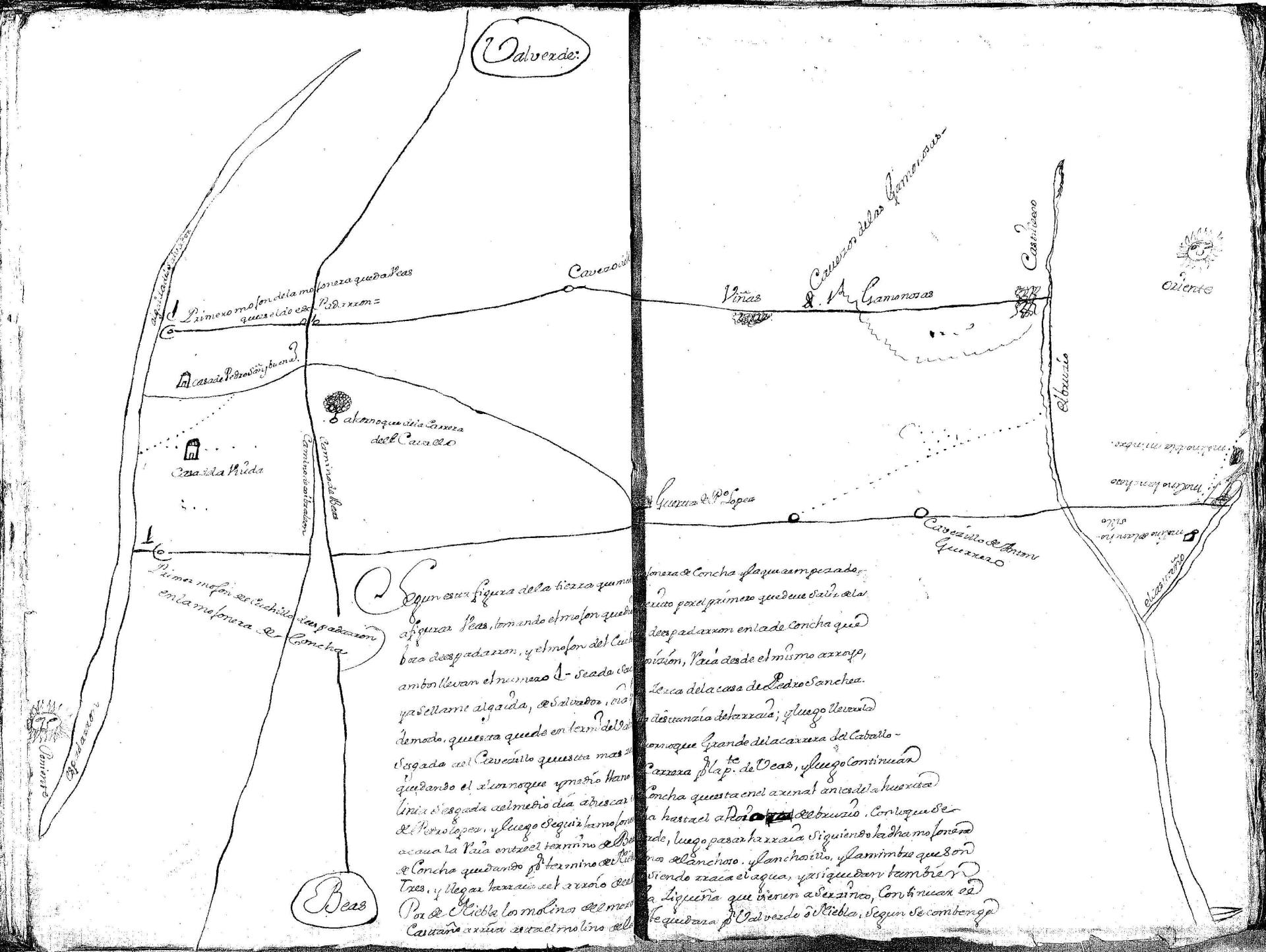 | 500 | ## | $aTítulo facticio | 500 | ## | $aOrientado con soles | 500 | ## | $aFecha tomada del legajo | 500 | ## | $aSeñala la ubicación de los núcleos y las dos líneas que cada uno pretende que sea el lindero (la mojonera de la Concha es la de Valverde), así como la solución que se propone | 500 | ## | $aIndica los caminos de Gibraleón y Beas, el arroyo del Salvador, Algaida, el Espadarrón, las Gamonosas, los plantíos, los arroyos del Brucio y del Castaño, los molinos y las casas que hay entre ambas líneas | 500 | ## | $aHay explicación | 500 | ## | $aCosido con carta de remisión al legajo de correspondencia con las villas de Huelva de 1735 |
