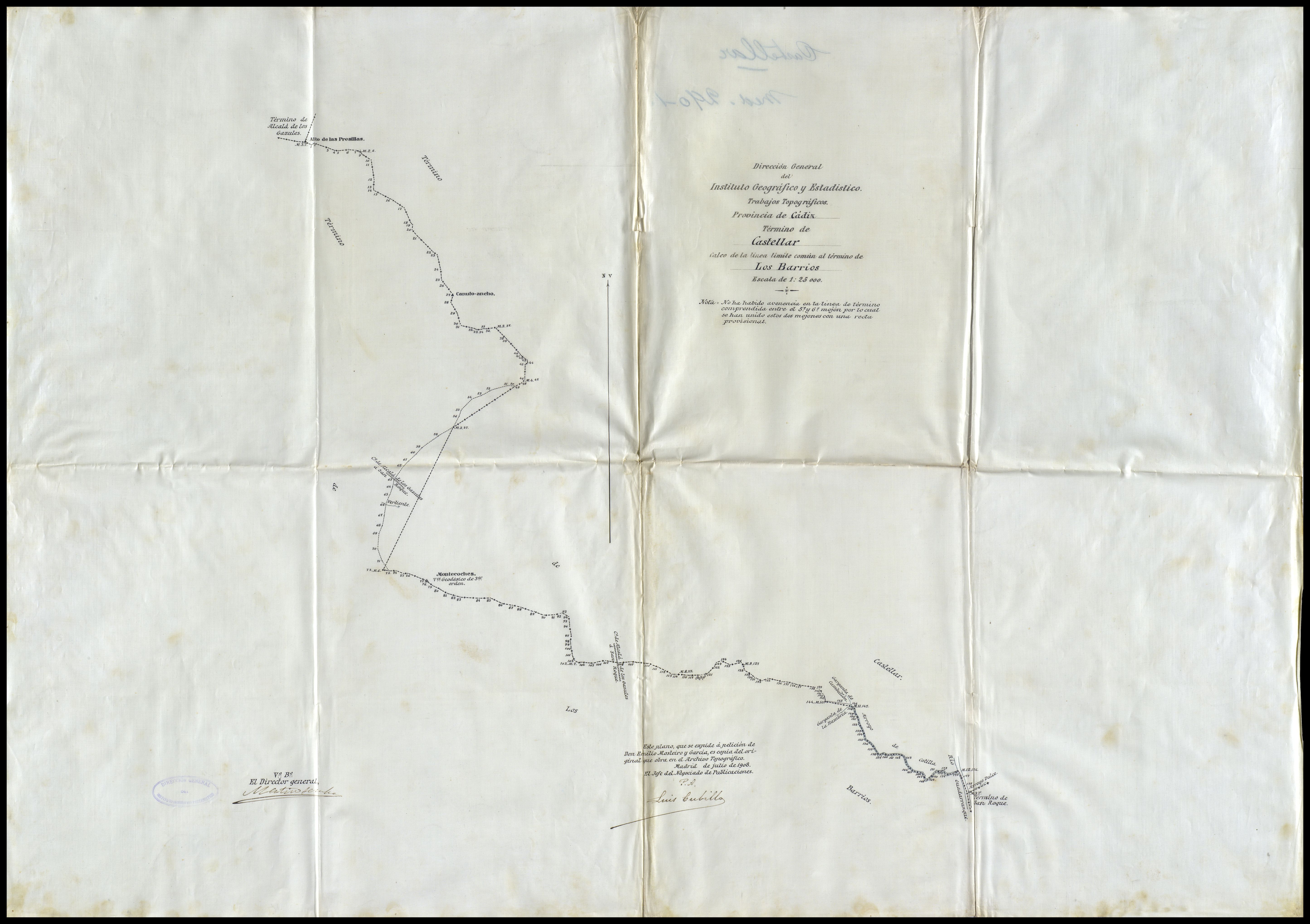 | 500 | ## | $aOrientado al N.V. con flecha | 500 | ## | $aNumeración de los mojones | 500 | ## | $aIndicación de los accidentes geográficos por los que pasa: Montes de Alto de las Presillas, Canuto Ancho, Montecoches, Gargantas de Cambullón y de la Humbría, Arroyos de Cotilla y Dulce, Río Guadarranque y camino de Alcalá de los Gazules a San Roque | 500 | ## | $aNota: No ha habido avenencia en la línea de término comprendida entre el 5º y el 6º mojón por lo cual se han unido estos dos mojones con una recta provisional | 500 | ## | $aNota: Este plano se expide a petición de Don Emilio Mosteiro y García, es copia del original que obra en el Archivo topográfico. Madrid [ ] de Julio de 1908. El Jefe del Negociado de Publicaciones, P.A. Luis Cubillo (rúbrica). VºBº El Director General [ilegible] (rúbrica) |