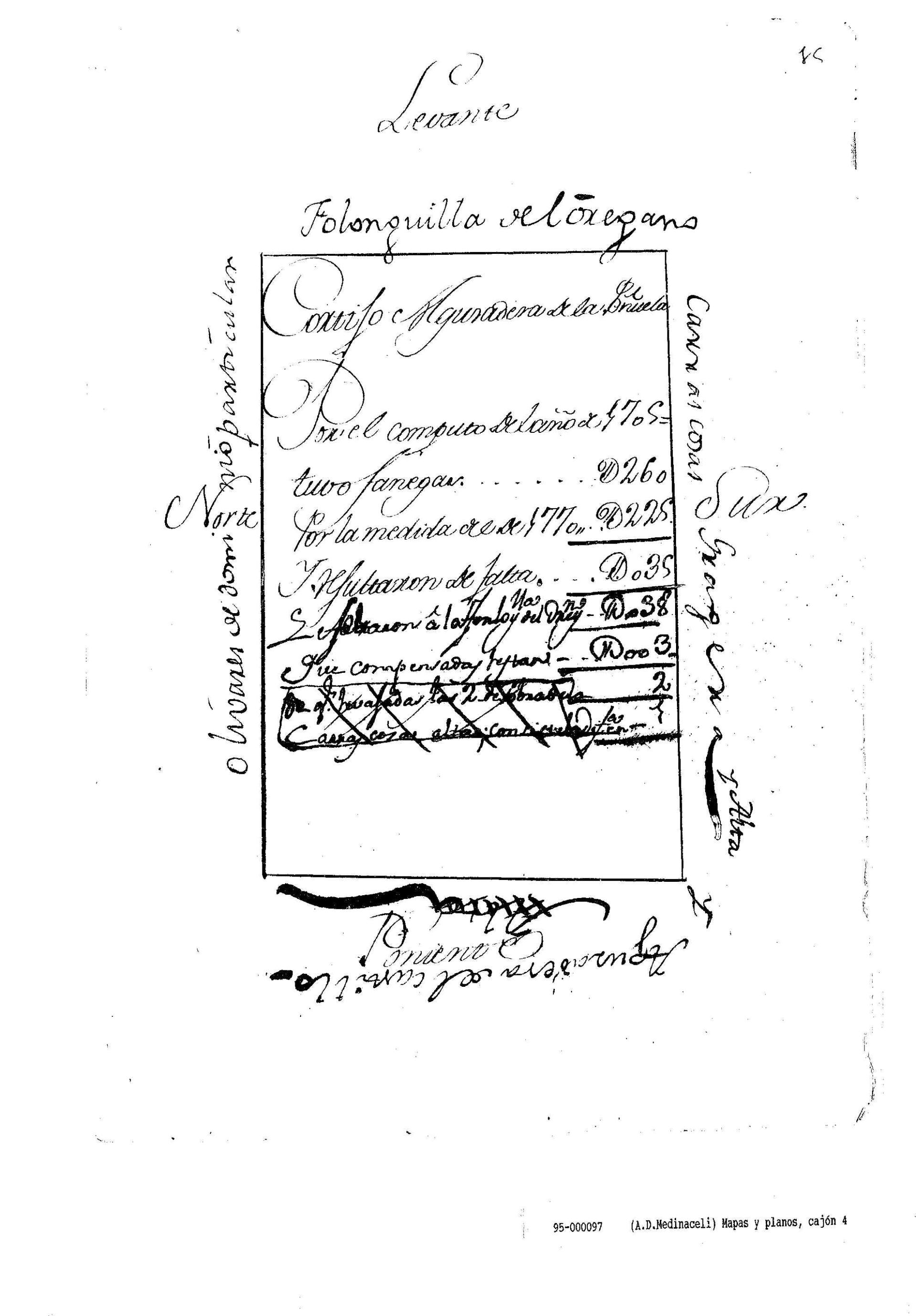 | 500 | ## | $aNo guarda la forma del cortijo | 500 | ## | $aIndicación de los puntos cardinales, el N al O | 500 | ## | $aFecha tomada de las mediciones | 500 | ## | $aIndica los terrenos colindantes | 500 | ## | $aNota: Por el cómputo del año de 1705 tuvo fanegas 260. Por la medida del de 1770, 225 y resultaron de falta 035. Le faltaron a la Folonglla. del Oregno. 038 que compensadas restan 003 | 500 | ## | $aHay otras anotaciones tachadas | 500 | ## | $aEn la esquina superior derecha, el nº 15 | 500 | ## | $aHoja suelta relacionada con los planos 89 a 116 (otros cortijos) |