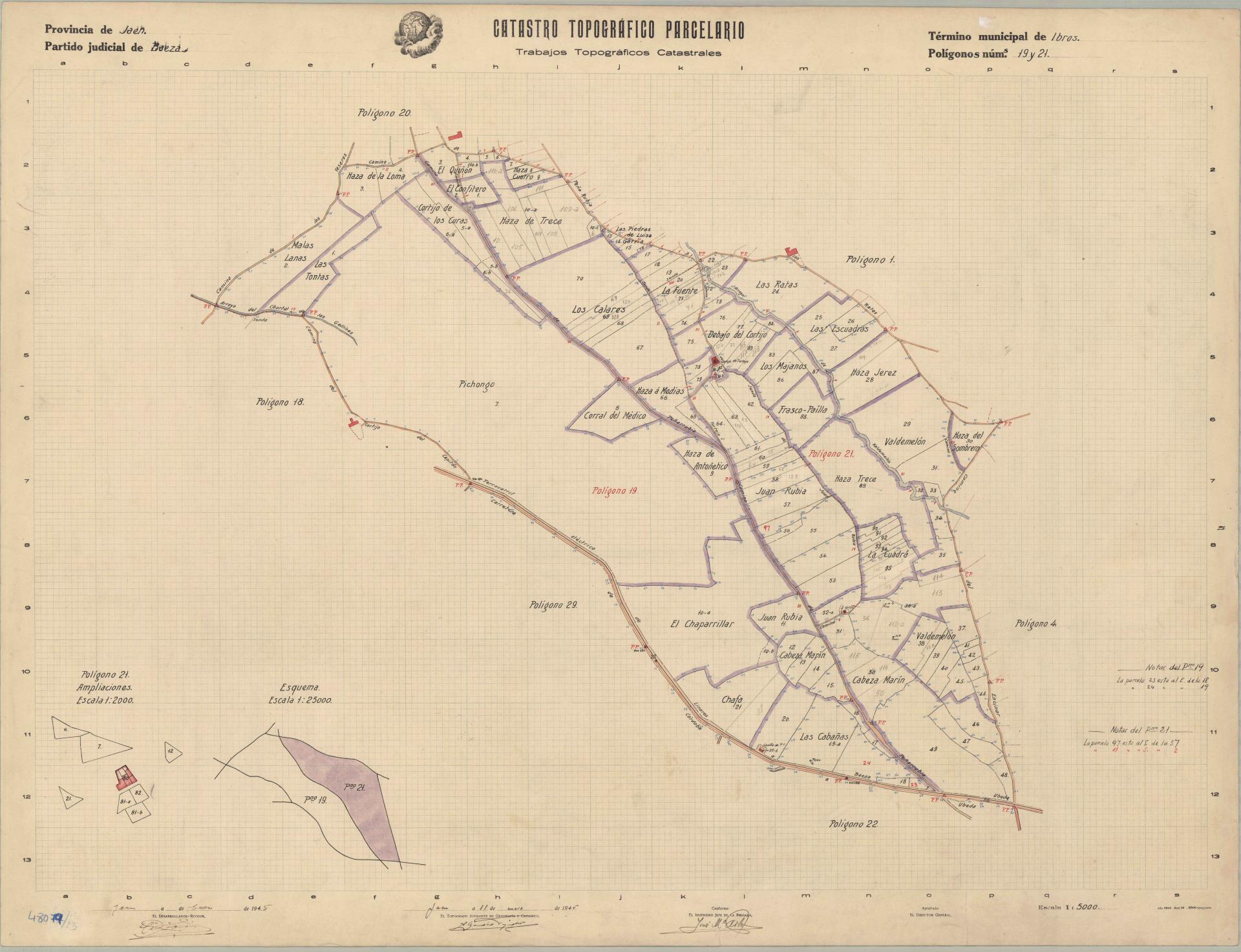 | 500 | ## | $aRecoge la carretera de Córdoba a Ubeda, linea de F.C.electrico de Linares a Baeza, los caminos del Encinar, del Cortijo del Capitán, de los Yeseros, de Peña Rubia a las Ratas | 500 | ## | $aSe divide en los parajes de Malas Lanas, Las Tontas, Haza de La Loma, El Quiñón, El Confitero, Haza Cuatro, Haza de Trece, Cortijo de los Curas, Los Calares, Las Piedras de Luisa Garcia, La Fuente, Las Ratas, Las Escuadras, Haza Jerez, Valdaemelón, Haza del Sombrero, Debajo del Cortijo, Los Majones, Frasco-Pailla, La Cuadra, Juan Rubia, Haza a Medias, Corral del Médico, Haza de Antoñetico, Cabeza Marin, Las Cabañas, El Chaparrillar, Chafa y Pichongo | 500 | ## | $aParcelación desigual | 500 | ## | $aRecoge croquis de la división del plano en los dos polígonos en escala 1: 25000 | 500 | ## | $aAparecen ampliaciones de parcelas en escala 1: 2000 | 500 | ## | $aSe conserva en buen estado | 500 | ## | $aEsta firmado por sus autores, en el campo 245 aparece entre [] las palabras que no son legibles |