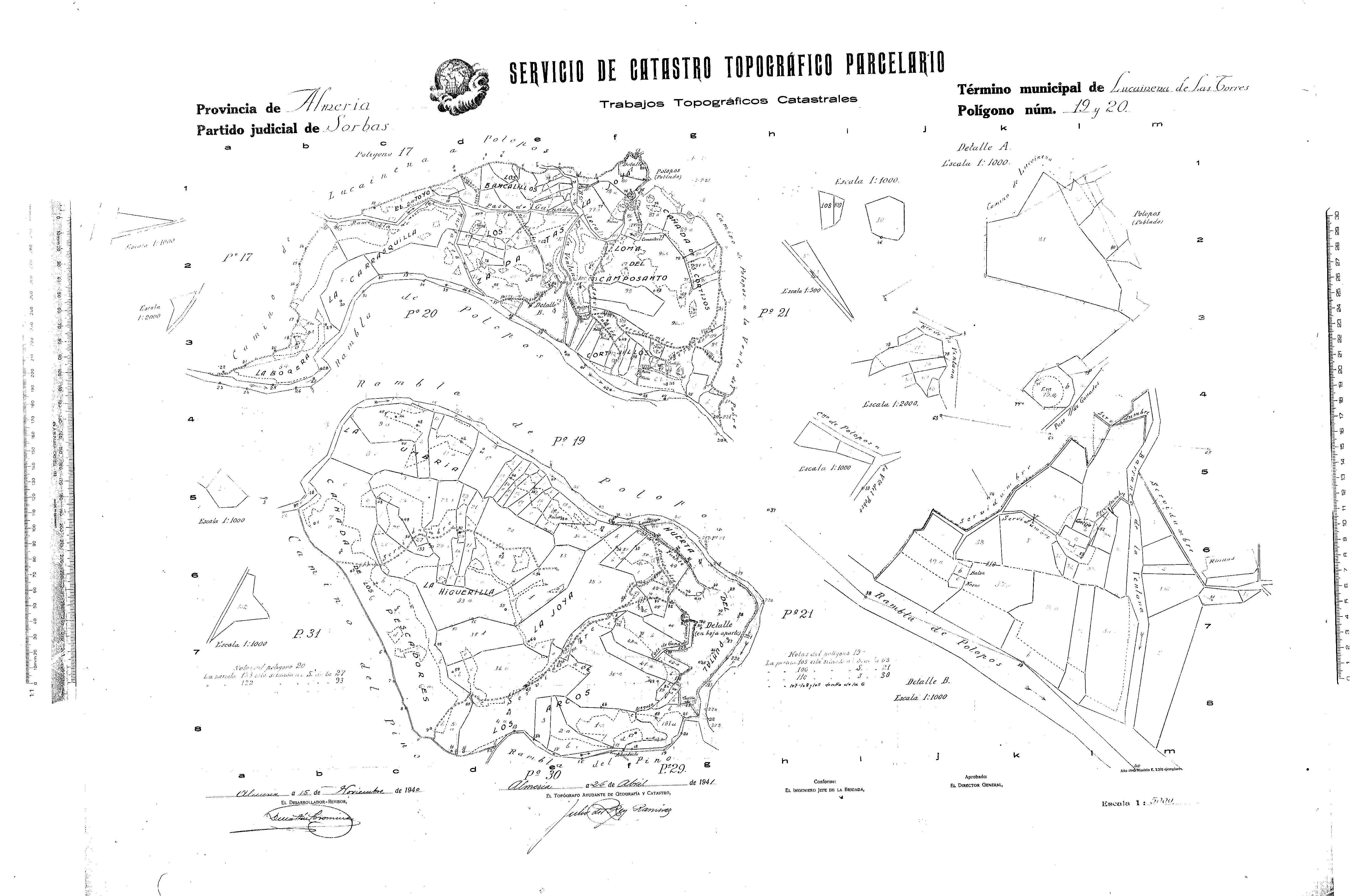 | 500 | ## | $a2 Planos a 1:5000, 9 detalles a 1:1000, 2 a 1:2000, 1 a 1:5000 | 500 | ## | $aAlmeria a 15 de Noviembre de 1940. EL desarrollador revisor (f) Dmartin Corominas. Almeria a 26 de Abril de 1941. El topografo ayudante de Geografia y catastro. (f)Julio del rey Ramirez | 500 | ## | $aPapel cuadriculado 1-8,a-m | 500 | ## | $aUbica las parcelas con numeros | 500 | ## | $a(por detras) D. Antonio Garcia Garcia Alcalde presidente de Lucainena de las Torres. Certifico: que este plano ha estado expuesto al publico en el plazo reglamentario y tiene la conformidad de este ayuntamiento, y para que conste se extiende la presente que firmo y sello con el de esta alcaldia. Lucainena de las Torres a 29 de Septiembre de 1946. El Alcalde (f) A. Garcia (sellado) Ayto. Lucainena de las Torres. AL. El secretario (f) (¿) | 500 | ## | $aEn el ejemplar del IGN aparecen los polígonos 19 y 20 juntos. En las copias del AHPA los polígonos aparecen por separado. | 500 | ## | $aEn el Archivo Histórico Provincial de Almería existen 2 copias de similares características. Recoge una flecha orientada al norte y una nota sobre la situación de varias parcelas. Incluye Detalle A y B con escala 1:1000. En el reverso de ambas copias se especifica que son realizadas por José Roig Ballesteros, Ingeniero Geógrafo Jefe de la Brigada Topográfica de Parcelación de la Provincia de Almería. Están fechadas en Almería, el 30 de abril de 1947 junto al sello de la Jefatura Provincial de Catastro Topográfico Parcelario de Almería. Copias en papel, impreso, colores azul, marrón y violeta, 49 x 75 cm. El campo 590 corresponde al ejemplar que se encuentra en este archivo |