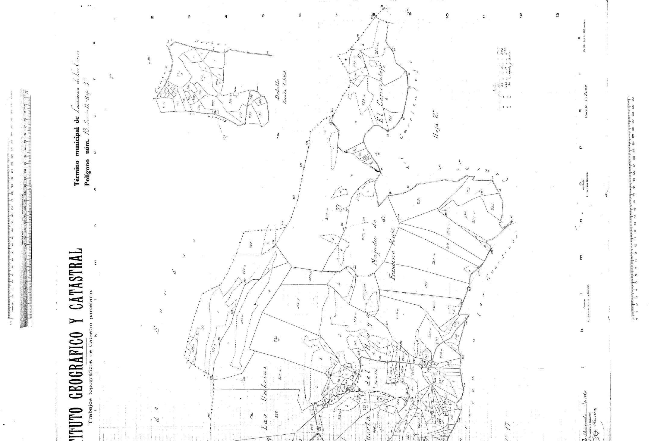| 500 | ## | $a1 Plano 1:2000 y 1 detalle a 1:1000 | 500 | ## | $aEstado regular | 500 | ## | $aAlmeria 8 de Octubre de 1940. EL desarrollador revisor (f) Dmartin Corominas. Almeria a 31 de Diciembre de 1940. El topografo ayudante de Geografia y catastro. (f) Julio del Rey Ramirez | 500 | ## | $aPapel cuadriculado 1-13,a-S | 500 | ## | $aUbica las parcelas con numeros | 500 | ## | $a(por detras) D. Antonio Garcia Garcia Alcalde presidente de Lucainena de las Torres. Certifico: que este plano ha estado expuesto al publico en el plazo reglamentario y tiene la conformidad de este ayuntamiento, y para que conste se extiende la presente que firmo y sello con el de esta alcaldia. Lucainena de las Torres a 29 de Septiembre de 1946. El Alcalde (f) A. Garcia (sellado) Ayto. Lucainena de las Torres. AL. El secretario (f) (¿) | 500 | ## | $aEn el Archivo Histórico Provincial de Almería existen 2 copias de similares características. Recoge una flecha orientada al norte y una nota sobre la situación de varias parcelas. En el reverso de ambas copias se especifica que son realizadas por José Roig Ballesteros, Ingeniero Geógrafo Jefe de la Brigada Topográfica de Parcelación de la Provincia de Almería. Están fechadas en Almería, el 30 de abril de 1947 junto al sello de la Jefatura Provincial de Catastro Topográfico Parcelario de Almería. Copias en papel, impreso, colores azul, marrón y violeta, 75 x 99 cm. El campo 590 corresponde al ejemplar que se encuentra en este archivo |