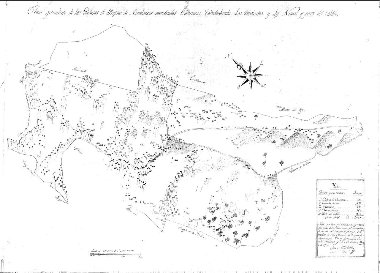 | 500 | ## | $aDentro de la cartela del índice aparece la firma del agrónomo | 500 | ## | $aManchas de humedad | 500 | ## | $aAparece en el plano la localización de las dehesas de propios de Aznalcázar, señalando las tierras limítrofes con sus denominaciones y si son de particulares | 500 | ## | $aAparecen los Cerros de la Tiesa y los Montes del Rey | 500 | ## | $aSe señala el norte | 500 | ## | $aLeyenda con los nombres de las dehesas y sus superficies en hectáreas y con una nota que dice: "la parte del valdío se la agrgaron por orden del gobernador para el completo de las dos mil fanegas de que consta la titulación de estas dehesas de propios de Aznalcázar. Por el agrónomo 1ª de esta provincia por S.M. Sevilla Mayo 5, 1890 Juan Mª Acosta | 500 | ## | $aEscala gráfica 12 cm 300 estadales de a cuatro varas |