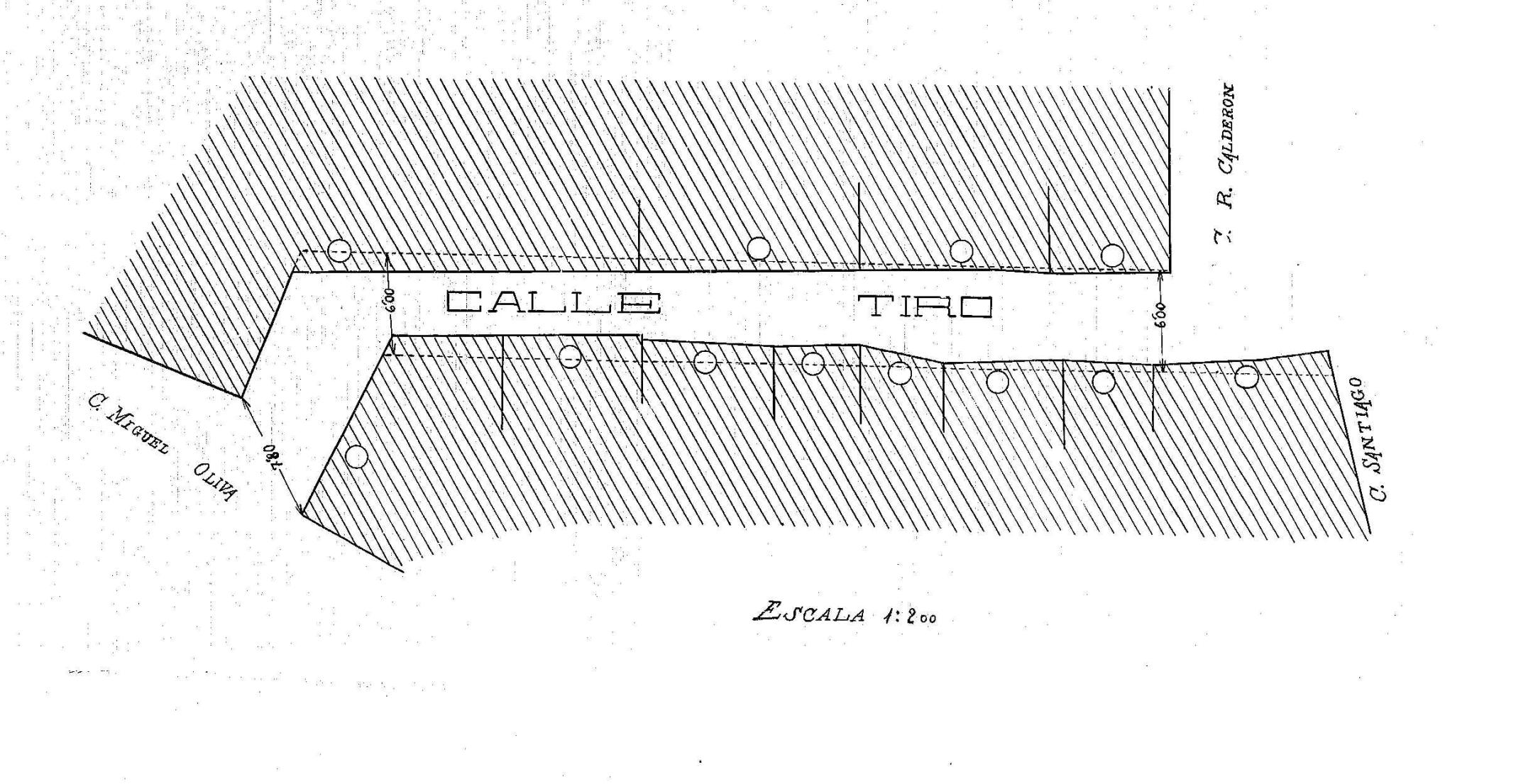 | 500 | ## | $aSin título, ni fecha | 500 | ## | $aAparece la calle Tiro con la alineación proyectada y sus aledañas Santiago, R. Calderón y Miguel Oliva | 500 | ## | $aRayado en negro la zona construída y en línea discontínua roja la alineación programada | 500 | ## | $aGrapado a un pliego en el que se lee: Calle Tiro núm. 66 | 500 | ## | $aSin signos de orientación |