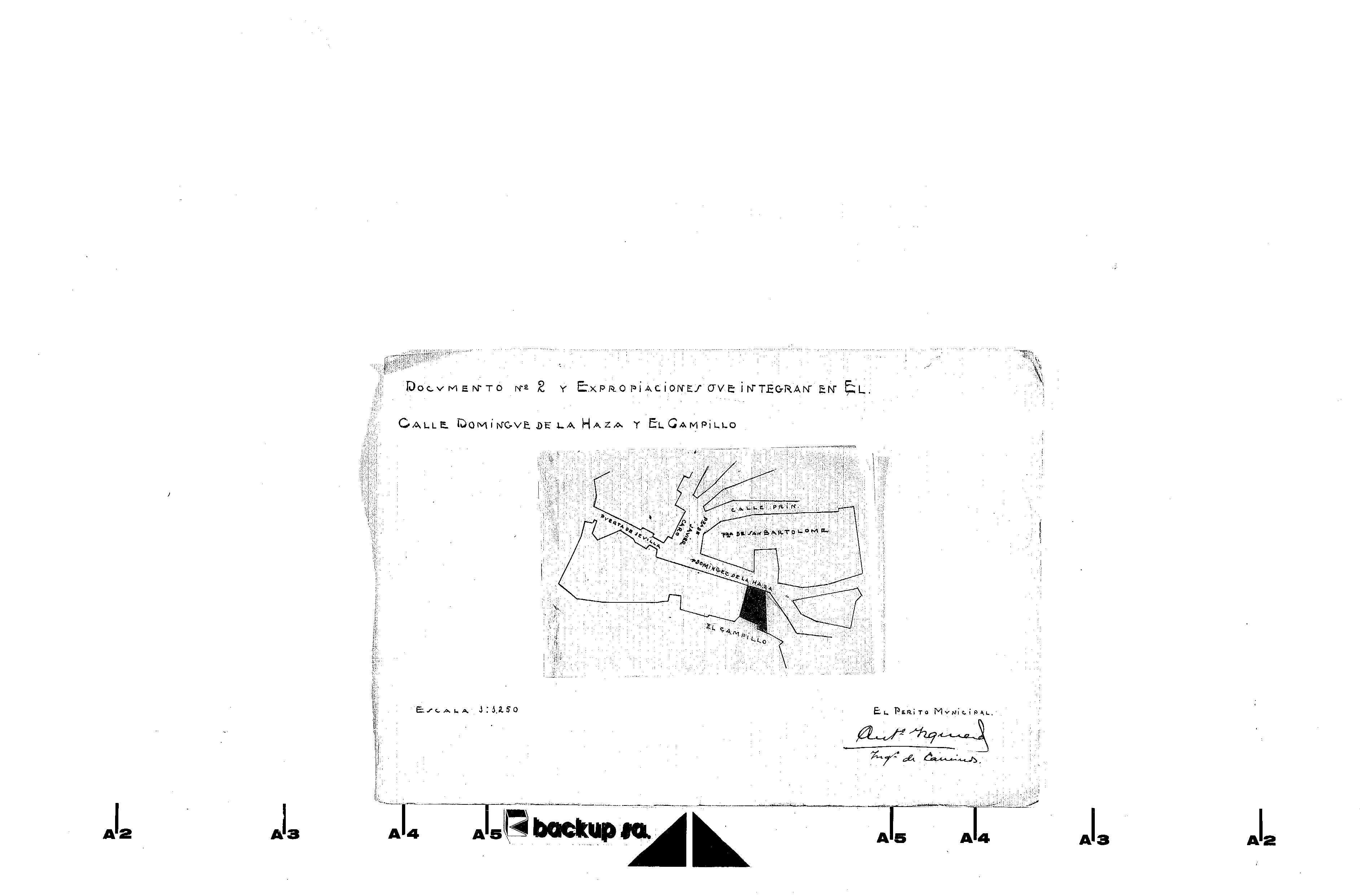 | 500 | ## | $aIndicaicón de la expropiación en rojo entre la calle Domínguez de la Haza y El Campillo | 500 | ## | $aEl plano es de papel vegetal y pequeñas dimensiones aparece pegado en un folio de papel donde aparece el título, la escal y la fimra del perito municipal | 500 | ## | $aLas iniciales del título están escritas en mayúsculas y con letras en rojo |