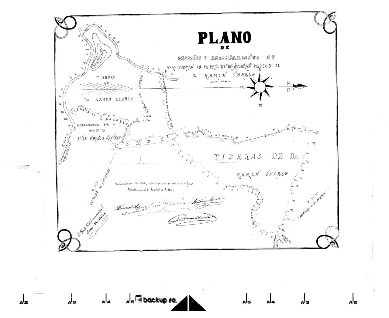 | 500 | ## | $aBien conservado | 500 | ## | $aPlano artístico | 500 | ## | $aOrientado | 500 | ## | $aVarias firmas de propietarios | 500 | ## | $aTierras colindantes a la propiedad de D. Ramón Chailó con el nombre de sus propietarios | 500 | ## | $aNumerosas medidas | 500 | ## | $aEn rojo el amojonamiento | 500 | ## | $aEn azul el arroyo Borgil | 500 | ## | $aCurvas de nivel |
