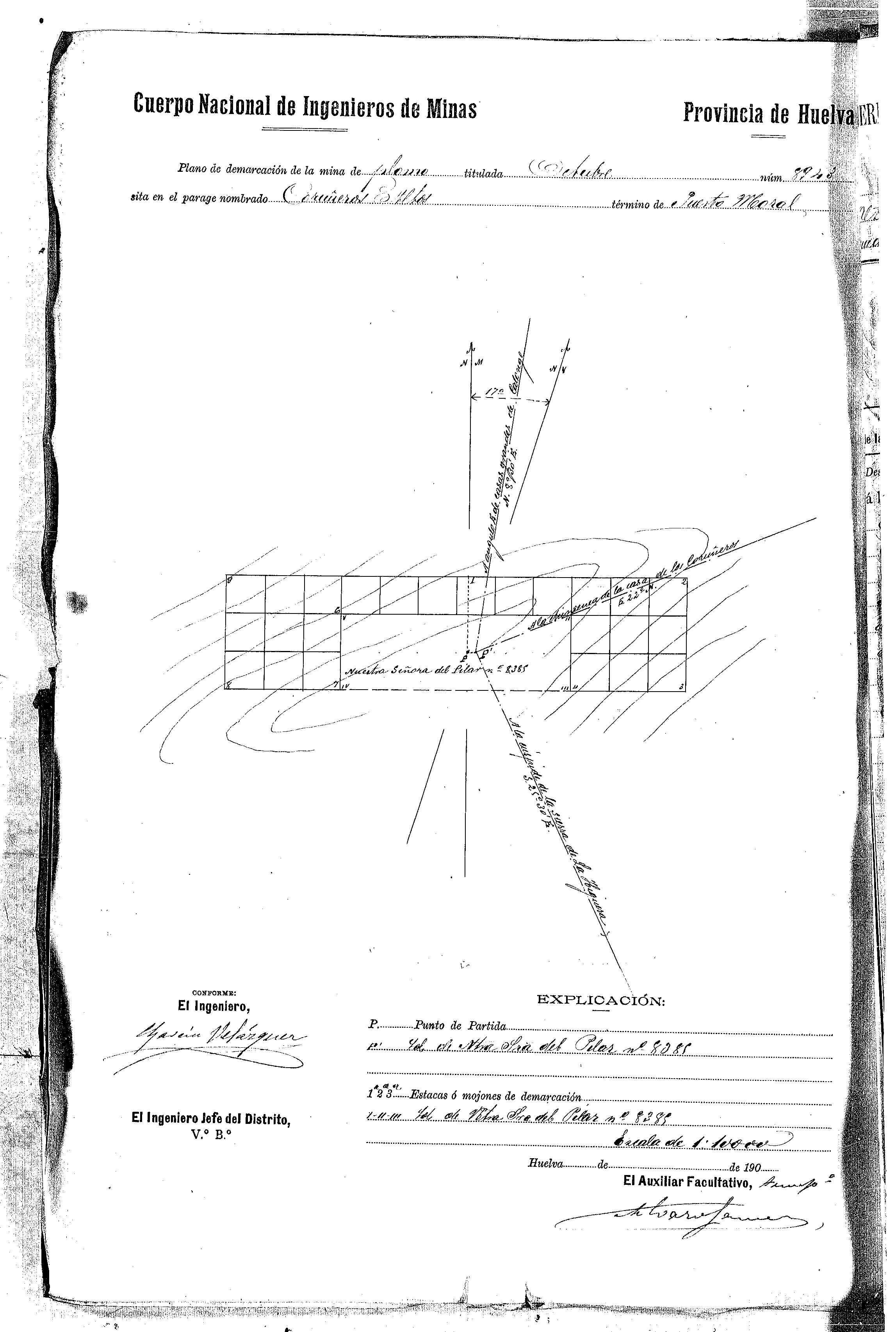 | 500 | ## | $aFirmas ms. | 500 | ## | $aOrientado al N.M. y al N.V. | 500 | ## | $aCuadricula la superficie de la mina dividiéndola en pertenencias, y sitúa las estacas del perímetro y un punto de partida (P) relacionándolo con referencias visuales fijas | 500 | ## | $aDelimita la mina colindante Nuestra Señora del Pilar | 500 | ## | $aEn el pie incluye una explicación relativa al punto de partida y a las estacas de demarcación | 500 | ## | $aContiene el sello del Cuerpo Nacional de Ingenieros de Minas de la Provincia de Huelva | 500 | ## | $aDibujado sobre formato impreso |