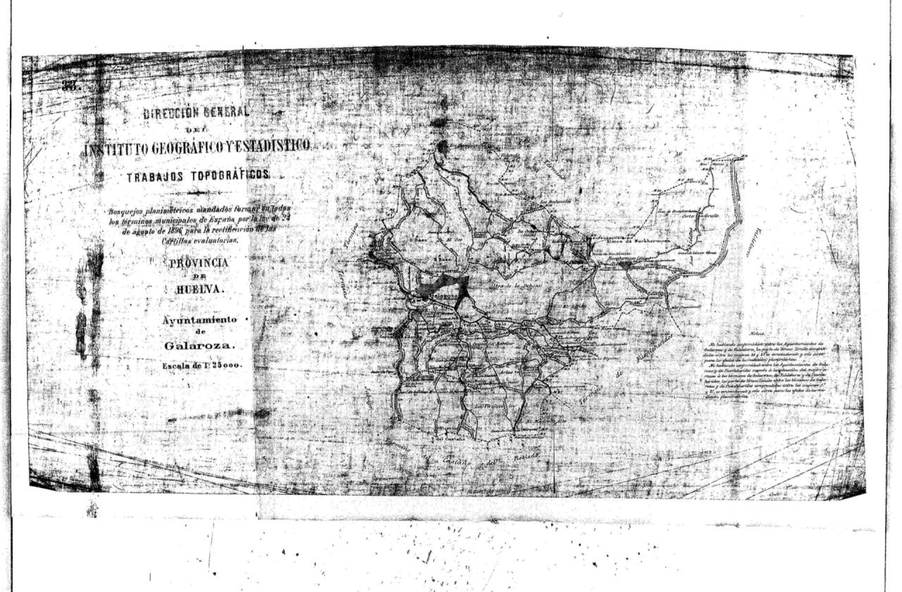 | 500 | ## | $aSe ha considerado Madrid como lugar para el pie de imprenta por ser la sede del Instituto Geográfico y Estadístico | 500 | ## | $aOrientado al N.V. | 500 | ## | $aRecoge el término municipal de Galaroza, la rivera del Múrtigas, otros cursos de agua, los principales picos, el emplazamiento del núcleo urbano y de las aldeas La Cañada y Navahermosa, la red viaria y la situación de numerosas casas | 500 | ## | $aSeñala el límite con los términos municipales de La Nava, Valdelarco, Fuenteheridos, Castaño del Robledo y Jabugo, indicando la localización de los mojones de término | 500 | ## | $aIncluye una nota en la que se puede leer: "No habiendo conformidad entre los Ayuntamientos de Galaroza y de Valdelarco, la parte de línea límite comprendida entre los mojones 26 y 27 es convencional y sólo sirve para los efectos de la medición planimétrica. No habiendo conformidad entre los Ayuntamientos de Galaroza y de Fuenteheridos respecto a la situación del mojón común a los términos de Galaroza, de Valdelarco y de Fuenteheridos, la parte de línea límite entre los términos de Galaroza y de Fuenteheridos comprendida entre los mojoes 1º y 2º, es convencional y sólo sirve para los efectos de la medición planimétrica | 500 | ## | $aSobre el título consta la siguiente nota: "Bosquejos planimétricos mandados formar en todos los términos municipales de España por la ley de 24 de Agosto de 1896 para la rectificación de las Cartillas evaluatorias | 500 | ## | $aEn el ángulo superior izquierdo consta el núm. 33 |