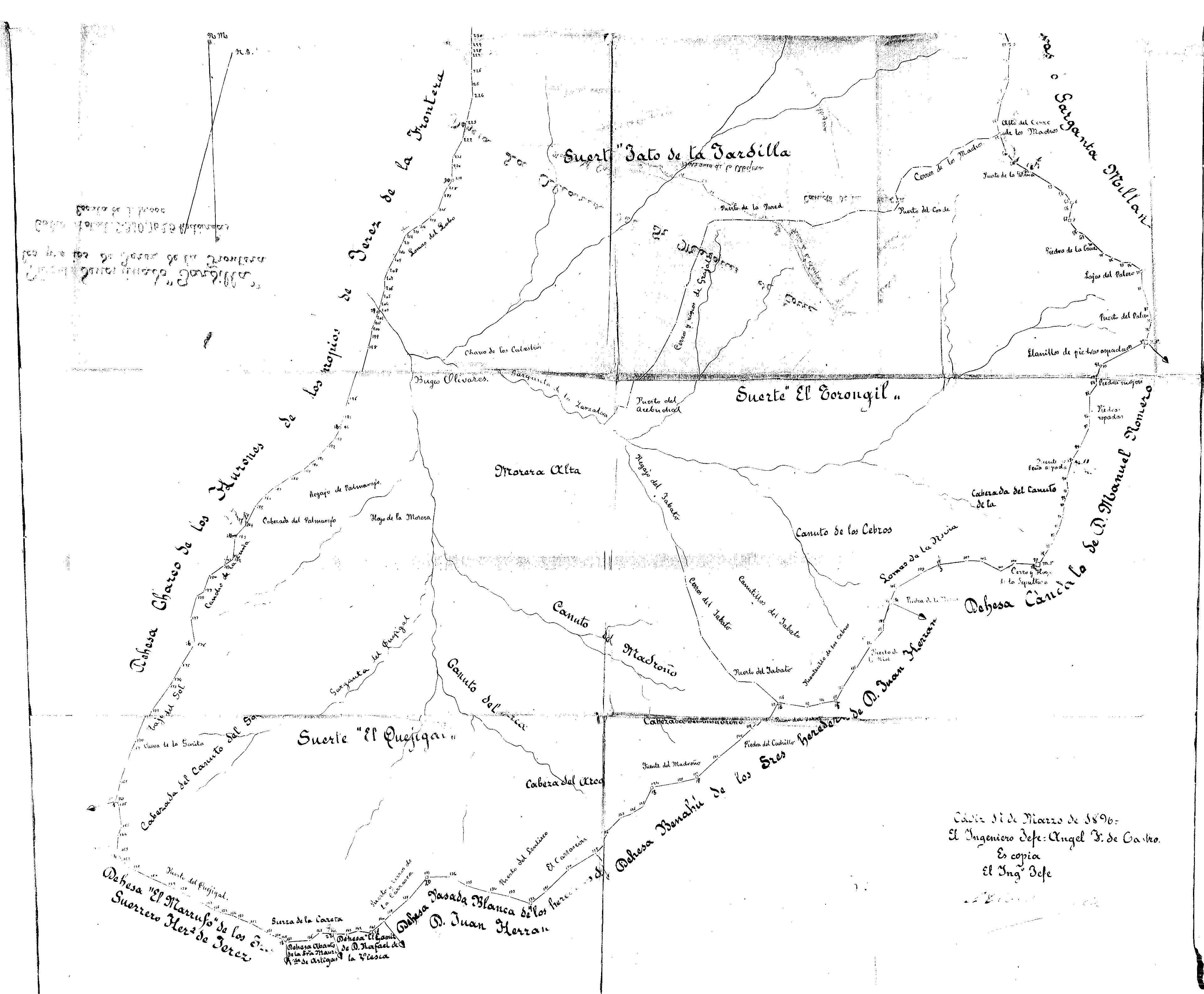 | 500 | ## | $aFirma ms. ilegible | 500 | ## | $aOrientado al N.M. y al N.G. | 500 | ## | $aRecoge diversos arroyos | 500 | ## | $aDelimita el monte Jardilla indicando la denominación y titulares de los terrenos colindantes y la situación de los mojones de deslinde | 500 | ## | $aIndica la cabida | 500 | ## | $aSobre la firma consta la siguiente nota: "El Ingeniero Jefe Anfel F. de Castro Es copia | 500 | ## | $aContiene el sello del Cuerpo de Ingenieros de Montes del Distrito Forestal de Cádiz | 500 | ## | $aEn el mismo archivo se conserva otro ejemplar de este plano |