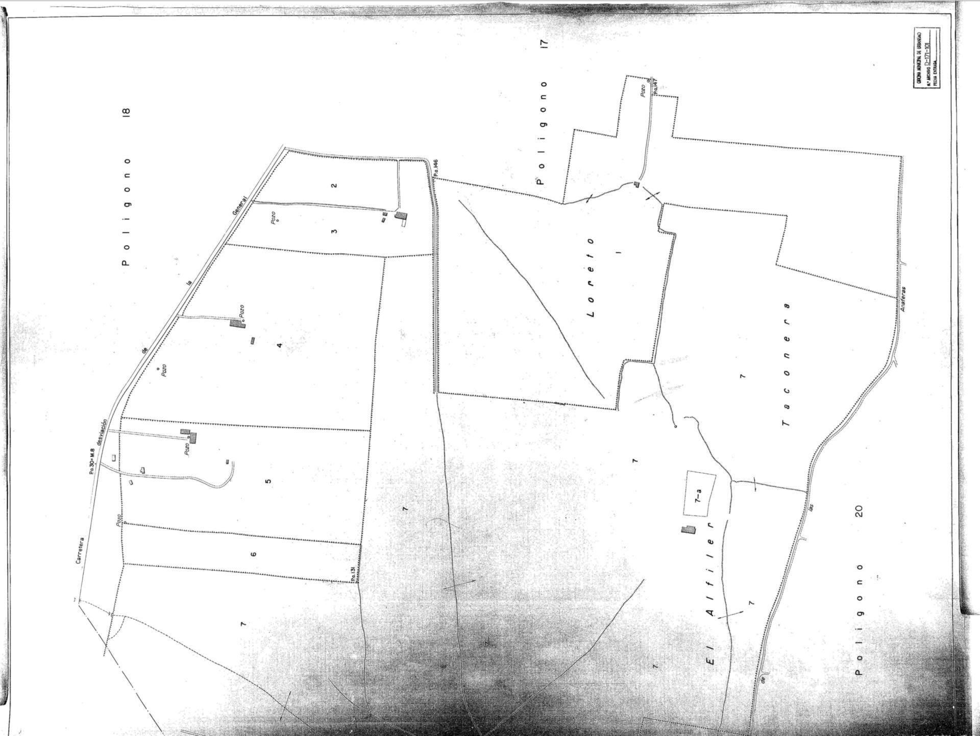 | 500 | ## | $aOrientado al N | 500 | ## | $aAparece el polígono nº 19 dividido en parcelas identificadas numéricamente, una carretera de desviación de la general, la hijuela de las Anaferas, y la situación de numerosas casas y pozos | 500 | ## | $aSeñala el límite con los polígonos 17, 18 y 20 | 500 | ## | $aContiene un sello de la Oficina Municipal de Urbanismo donde consta la signatura |
