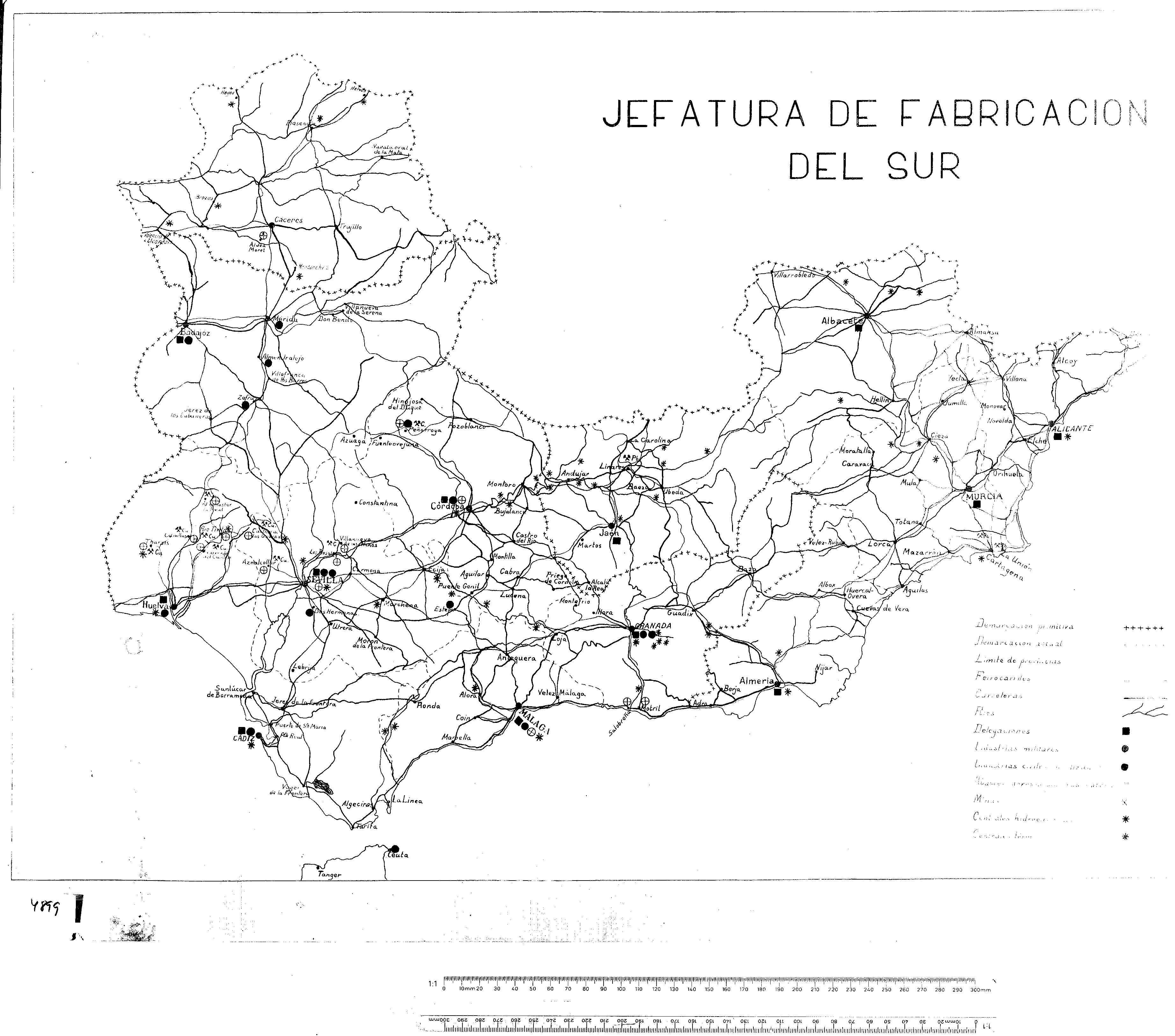 | 500 | ## | $aAparecen las comunidades de Extremadura y Andalucía y las provincias de Albacete, Murcia y Alicante, sus ríos, la demarcación primitiva, la demarcación de ese momento, los límites de provincia, y los trazados de las líneas de ferrocarril y de las carreteras | 500 | ## | $aSeñala la situación de las industrias militares, de las industrias civiles movilizadas, de las minas, de las centrales hidroeléctricas y térmicas y de los abastecedores de primeras materias | 500 | ## | $aContiene una leyenda relativa a la información contenida en el mapa |