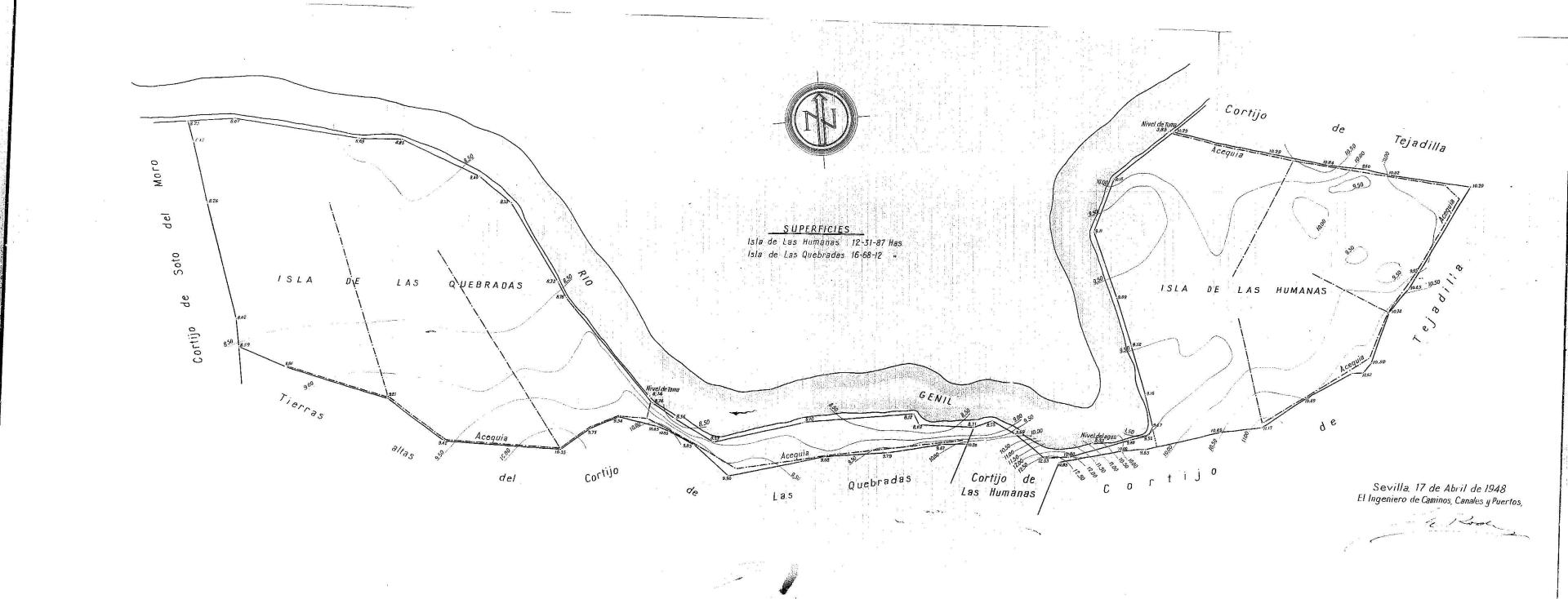 | 500 | ## | $aExpediente: Proyecto de puesta en riego. Fincas de las islas de las Humanas y de las Quebradas. Propietario: D. Juan Vargas Ubach. Término municipal de Ecija. Sevilla. Río Genil. Ingeniero de Caminos, Canales y Puertos D. Juan Ignacio de Roda Cassinello. Año, 1948. Carpeta: hoja núm. 2. Documento núm. 2. Planos. Encuadernado. Informe Agronómico | 500 | ## | $aOrientado con el N al NO del plano | 500 | ## | $aDelimitado por el río Genil, cortijo de Soto del Moro, tierras altas del cortijo de las Quebradas, cortijo de las Aumanes y cortijo de Tejadilla. Acequias y otros elementos de riego. Puntos de sondeos, numerados y encerrados en círculo verde. Es un grupo agrológico único, sombreado en verde | 500 | ## | $aExistencia de copia idéntica, color, en otra carpeta del mismo nombre, dentro del mismo legajo pero con firma manuscrita |