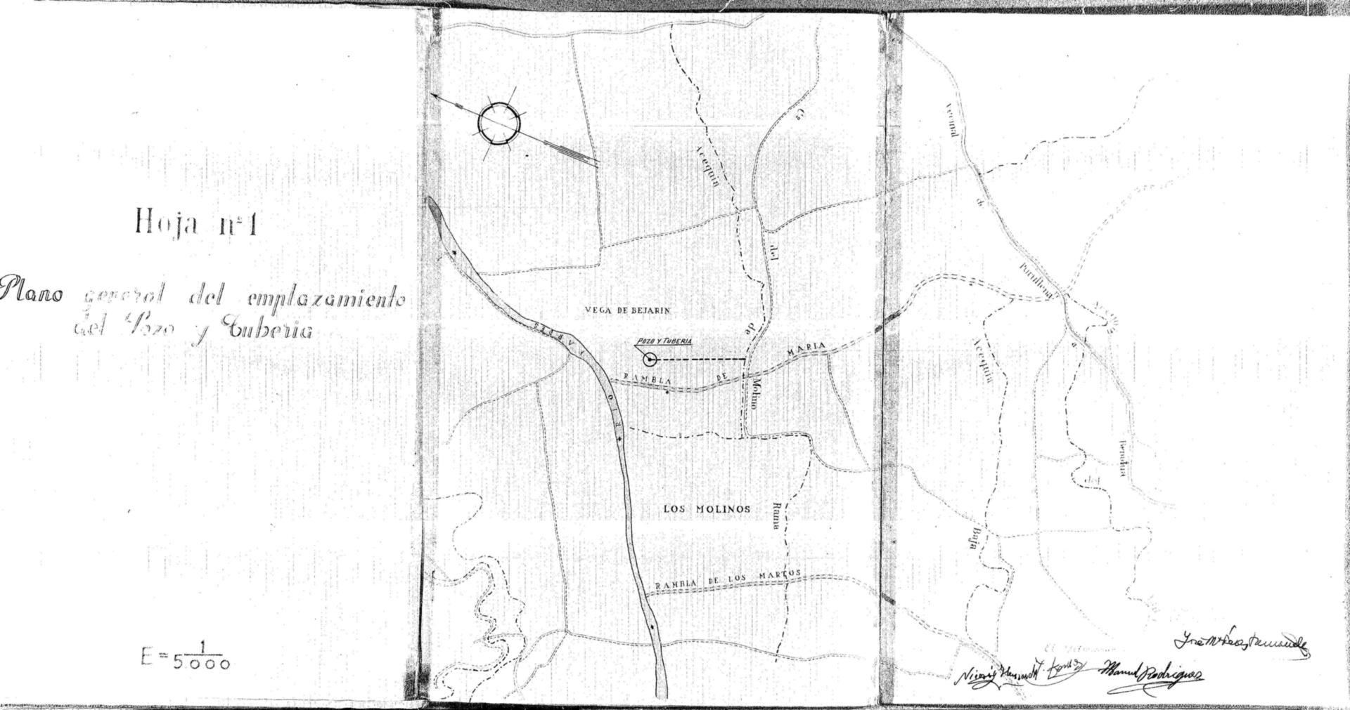 | 500 | ## | $aE-2790 al E-2823. Concesiones Granada. E-1/59 Granada al E-82/59. E-20/59. Ministerio de Obras Públicas y Urbanismo. Comisaría de Aguas del Guadalquivir. Ref. E-20/59. Expediente Comunidad de Regantes en formación de la Acequia de Rama, Pago Rama Baja. Solicitud autorización para realizar investigaciones aguas subterráneas proximidades Rambla de María, alfuente río Fardes. T.M. de Purullena, Granada. Comunidad de Regantes del Pozo de Vargas de Bejarín. Proyecto para la legalización de un pozo con tubería de conducción en la Vega de Bejarín en el término municipal de Purullena (Provincia de Granada). El Ingeniero autor del proyecto D. José María Pérez Hernández. Año 1959 | 500 | ## | $aFirmas manuscritas | 500 | ## | $aOrientado N al NW del plano | 500 | ## | $aSe representa el río Fardes, las Ramblas de María y de Los Martos (en azul), en amarillo el camino vecinal de Purullena a Benalua, en rojo el pozo y la tubería apareciendo en la base también toponimia |