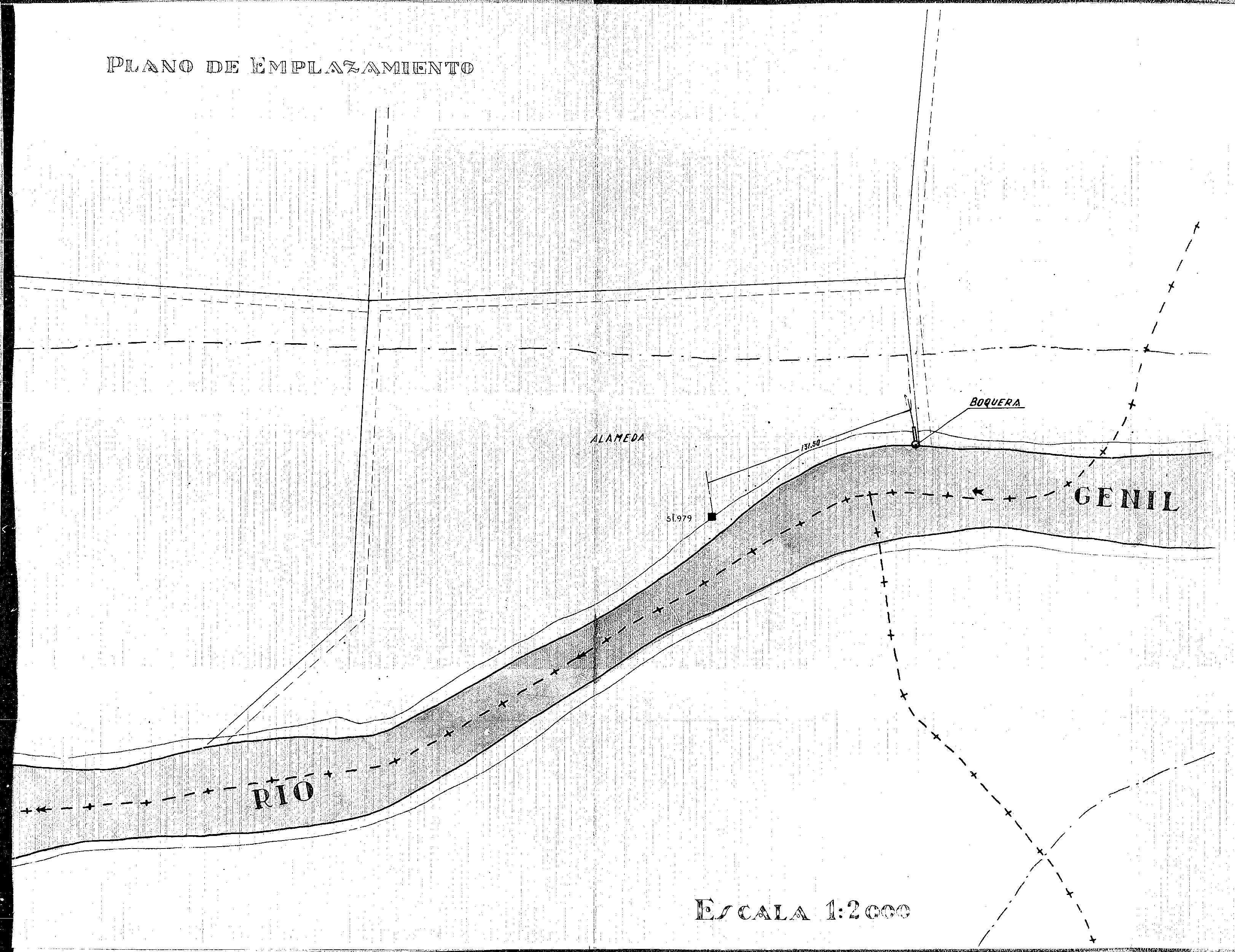 | 500 | ## | $aE-2790 al E-2823. Concesiones Granada. E-1/59 Granada al E-82/59. E-56/59. Ministerio de Obras Públicas. Comisaría de Aguas del Guadalquivir. Ref. E-56/59. Expediente D. José Arenas Villaldea y D. Antonio Rojas González. Solicitando autorización de una boquera en finca de su propiedad ribereña con la margen derecha del río Genil, sitio Pago de la Mimbre. T.M. de Fuente Vaqueros (Granada). Proyecto de construcción de una boquera en la margen derecha del río Genil "Pago de la Mimbre" en la finca propiedad de D. José Arenas Villaldea y D. Antonio Rojas González en término municipal de Fuente Vaqueros (Granada). El Ingeniero autor del proyecto D. José María Pérez Hernández. Año 1959 | 500 | ## | $aSe representa el río Genil, en el lugar en el que se localiza la boquera, señalándose además una alameda próxima |
