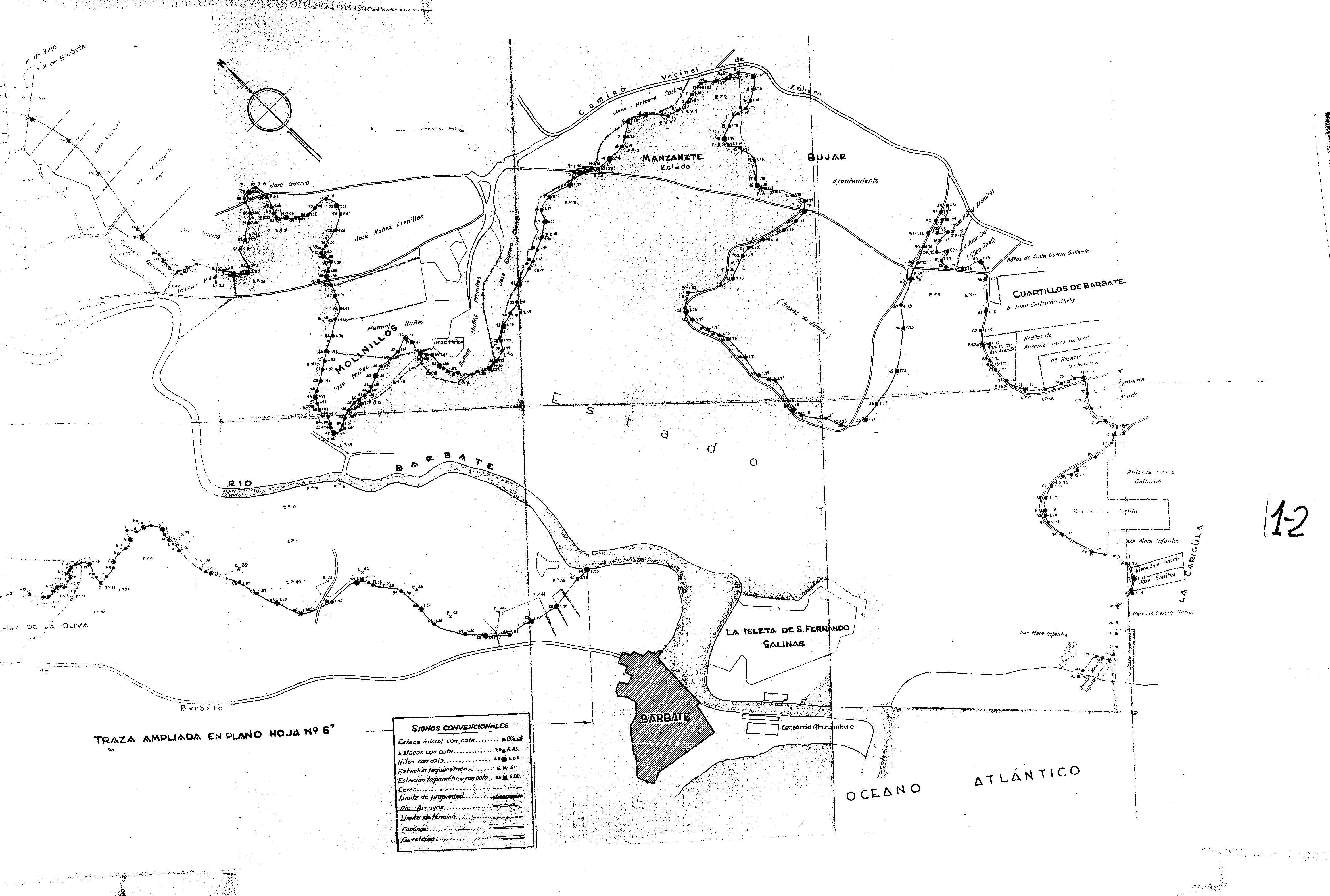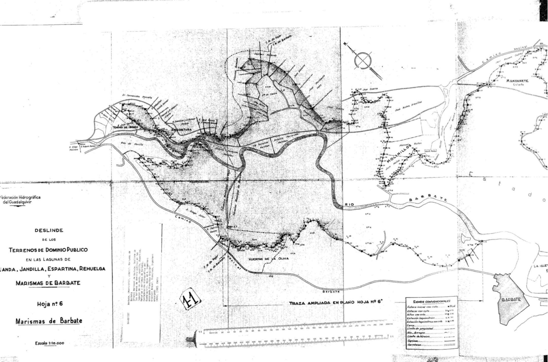| 500 | ## | $aConfederación Hidrográfica del Guadalquivir. Deslinde de los terrenos de dominio público en las lagunas de La Janda, Jandilla, Espartina, Rehuelga y marismas de Barbate. Ingeniero D. Francisco Graciani Brazal. Año 1949 | 500 | ## | $aEncarpetado | 500 | ## | $aFirma manuscrita del autor | 500 | ## | $aOrientado N al NO del plano | 500 | ## | $aNota explicativa sobre "Signos convencionales | 500 | ## | $aSe representa, en azul, la zona de dominio público delimitado por la línea de deslinde. Se señalan las parcelas con sus nombres y los límites de propiedad con los propietarios. También aparecen río Barbate y arroyos, además del Océano Atlántico, el núcleo de Barbate y caminos, así como límites de T.M. Se señala la "traza ampliada en plano Hoja nº 6". La línea de deslinde presenta estacas, hitos y estaciones | 500 | ## | $aAnotaciones a lápiz | 500 | ## | $aEn mismo legajo y expediente otro ejemplar del proyecto con copia idéntica |