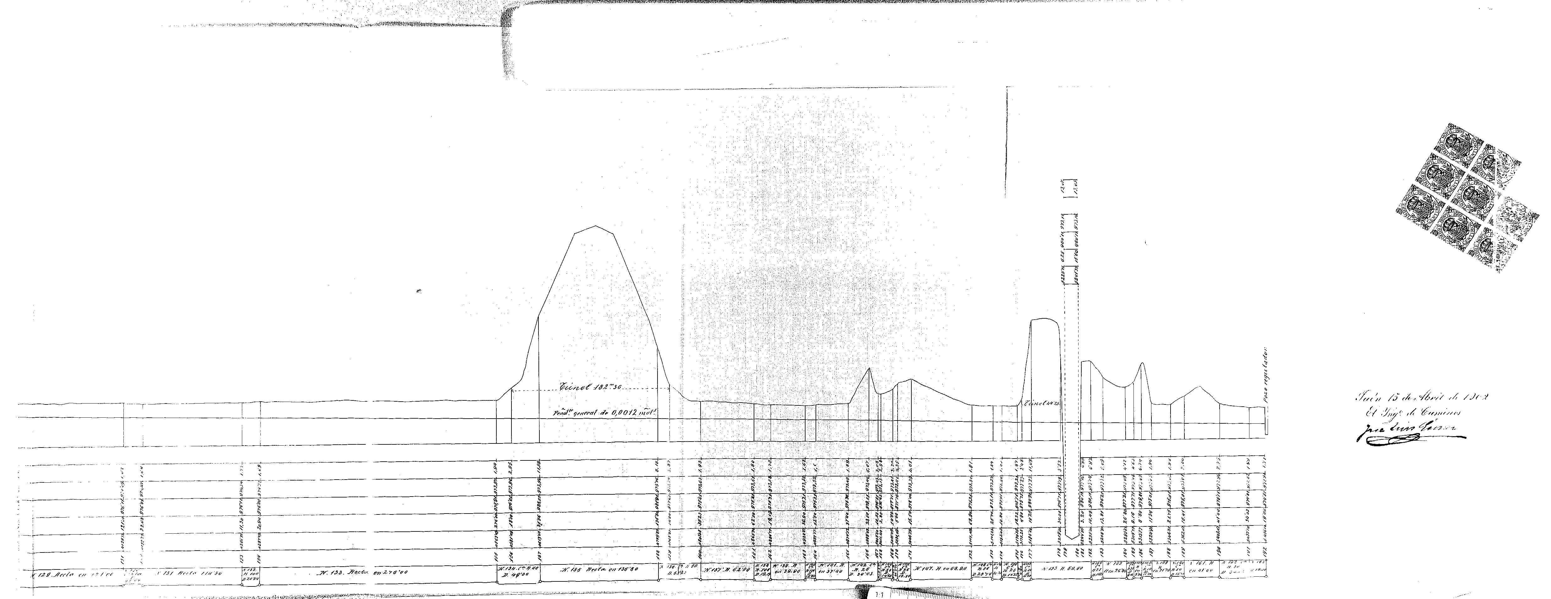 | 500 | ## | $aExpediente 914 al 924. Jaén. Ministerio de Obras Públicas. Comisaría de Aguas del Guadalquivir. Ref. E-915. Expediente D. José Luis Gómez Navarro. Clase Energía Eléctrica. Corriente Arroyo Aguascebas. T.M. Villacarrillo, Villanueva, Iznatoraf y Sorihuela (Jaén). 1902 | 500 | ## | $aEncarpetado | 500 | ## | $aPresenta ocho pólizas | 500 | ## | $aSe representa el perfil de la canalización con indicación del relieve así como elementos de interés: arroyos y túneles. El perfil presenta un tramo (pendiente general) del cual se facilita información sobre rasantes. Asimismo aparecen anotaciones numéricas sobre: cotas rojas, ordenadas, distancias al origen y alineaciones, así como referencias a los perfiles transversales |