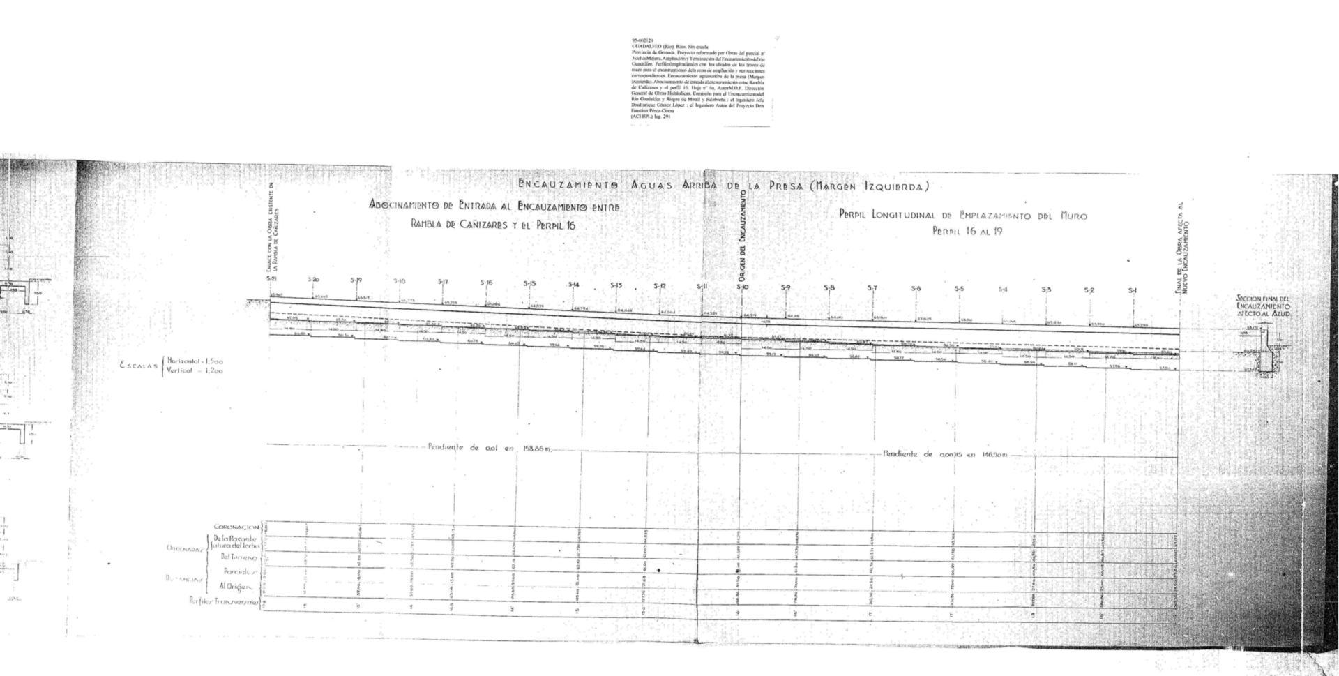| 500 | ## | $aExpediente: Secc. 1. Leg. 291. Estante M. Tabla 1-4. M.O.P. Dirección General de Obras Hidráulicas. Comisión para el Encauzamiento del Río Guadalfeo y Riegos de Motril y Salobreña. Provincia de Granada. 2º Proyecto reformado por obras del Parcial nº 3 del de "Mejora, Ampliación y Terminación del Encauzamiento del Río Guadalfeo". Ingeniero Autor del Reformado D. Faustino Pérez-Cirera Jiménez-Herrera. Año 1948 | 500 | ## | $aFirmas ms. | 500 | ## | $aAparece el perfil, el final del encauzamiento afecto al azud, el vértice final del abocinamiento, 12 secciones y la cadena de Salobreña | 500 | ## | $aContiene más perfiles longitudinales, alzados y secciones | 500 | ## | $aTiene el sello del M.O.P. Comisión para el encauzamiento del Río Guadalfeo y Riegos de Motril y Salobreña |