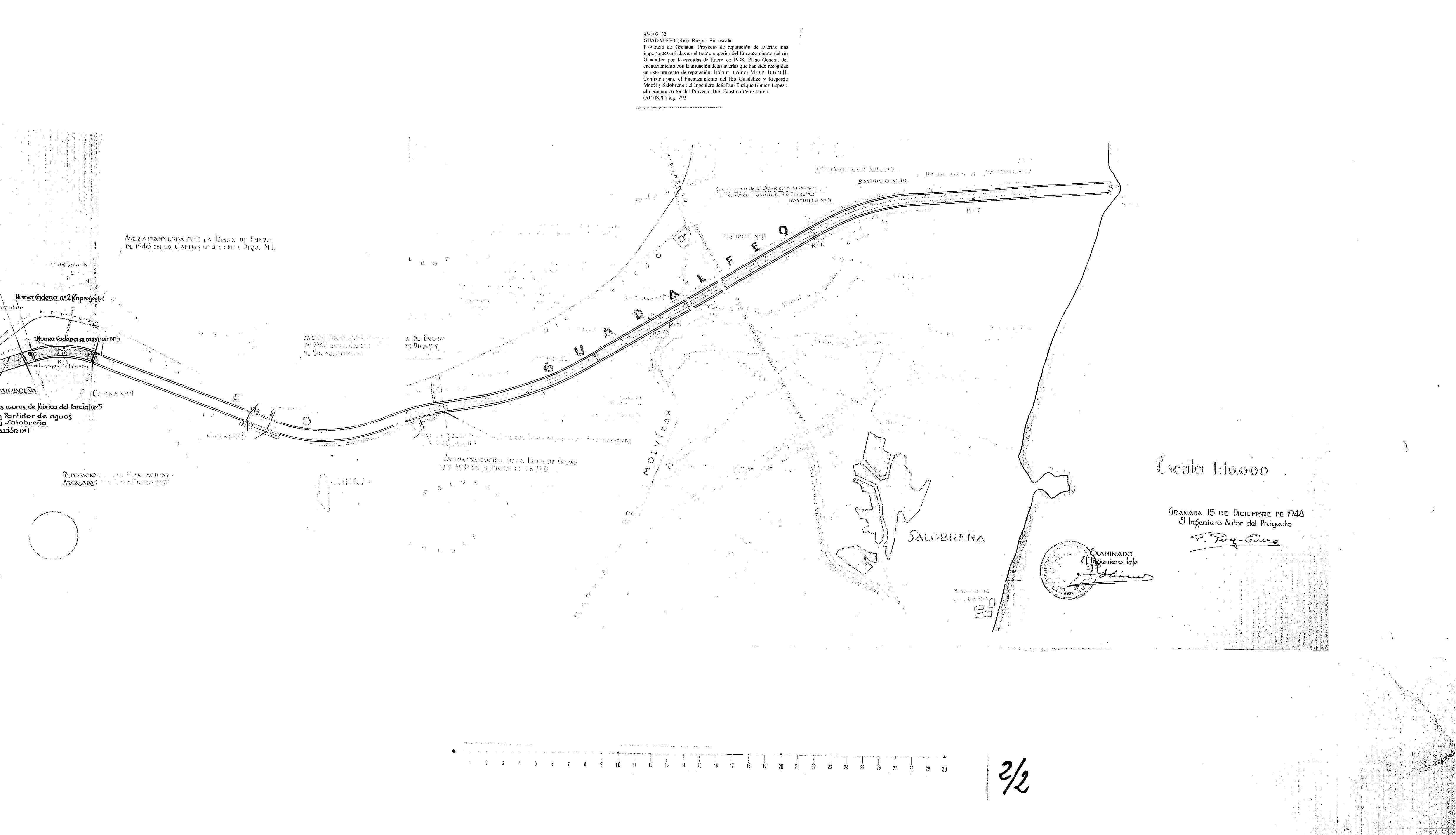 | 500 | ## | $aExpediente: Secc. 1. Leg. 292. Estante M. Tabla 1-5. M.O.P. Dirección General de Obras Hidráulicas. Comisión para el encauzamiento del Río Guadalfeo y Riegos de Motril y Salobreña. Proyecto de reparaciones más urgentes de las averías sufridas en el tramo de cabeza del encauzamiento del río Guadalfeo con motivo de las crecidas de Enero de 1948. Ingeniero autor del Proyecto D. F. Pérez-Cirera. Año 1948 | 500 | ## | $aFirmas ms. | 500 | ## | $aContiene Rosa de los Vientos con el N.M. orientado al SW del plano | 500 | ## | $aSe ve el mar Mediterráneo, el río Guadalfeo, las ramblas de Cañizares y Molvizar, el barranco del Buho y el delta actual del río | 500 | ## | $aAparecen las opblaciones de Salobreña, Lobres, el Barrio de la Gurda, la carretera de Málaga a Almería, la variante de Salobreña, numerosos caminos, cauces, ramales, las averías producidas, cortijos, los terrenos invadidos en octubre de 1934, rastrillos, hitos, canales, cadenas, la obra proyectada, las acequias de Salobreña y Grande de la Vega, el FC de la cantera al puerto, la Melcochera, el canal de Lobres, la ermita de Santa Ana, el molino de Menuico, una casilla de carabineros y la línea hipotética de la futura playa | 500 | ## | $aTiene el sello del M.O.P. Comisión para el Encauzamiento del Río Guadalfeo y Riegos de Motril y Salobreña |