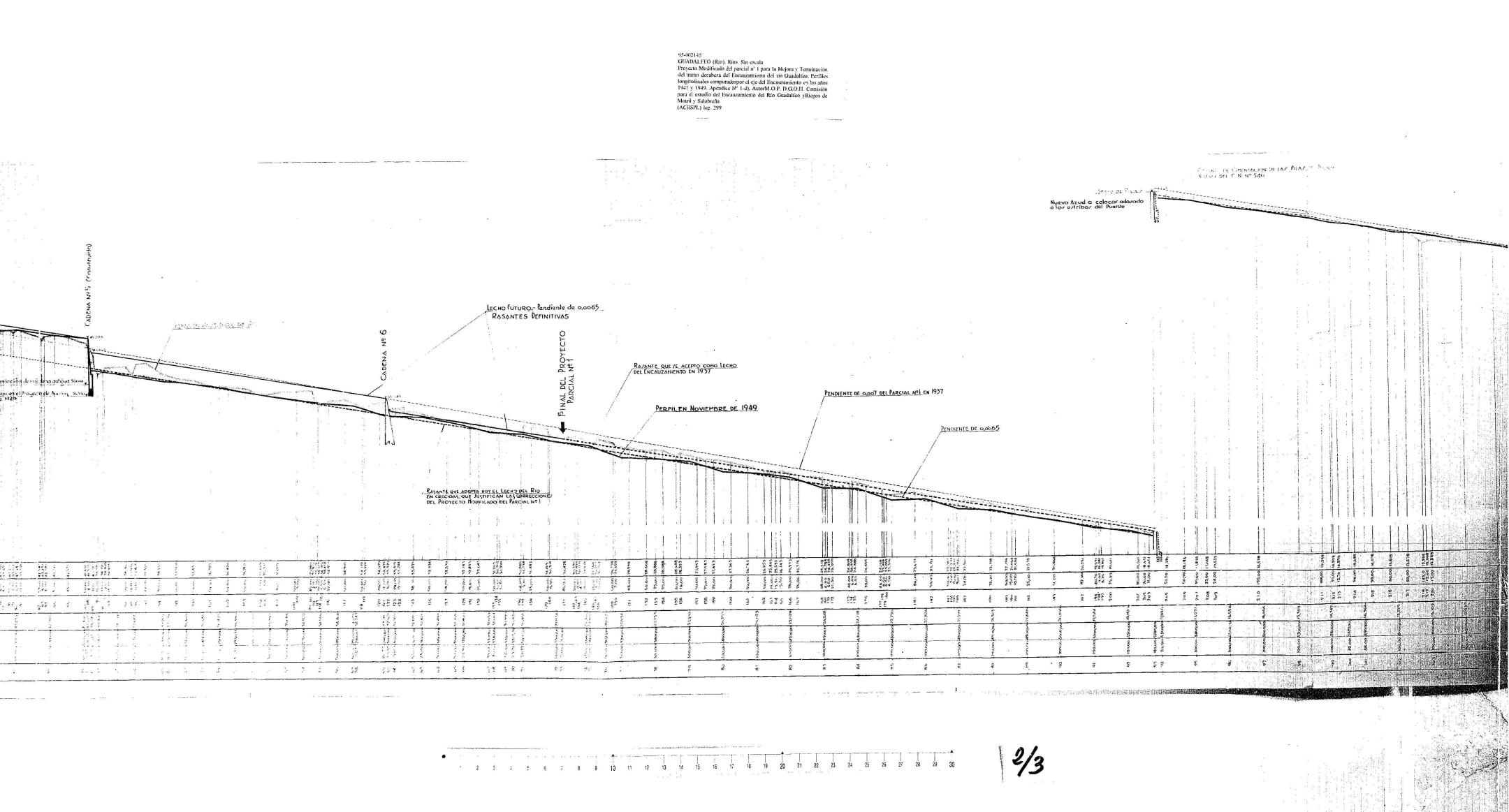 | 500 | ## | $aExpediente: Secc. 1. Leg. 299. Estante M. Tabla 1-12. M.O.P. D.G.O.H. Comisión para el Encauzamiento del Río Guadalfeo y Riegos de Motril y Salobreña. Provincia de Granada. Proyecto modificado del parcial nº 1 para la mejora y terminación del tramo de cabeza del encauzamiento del río Guadalfeo. Ingeniero Autor D. Faustino Pérez-Cirera Jiménez-Herrera. Año 1950 | 500 | ## | $aSe ve el mar Mediterráneo y el río Guadalfeo | 500 | ## | $aAparecen en el mismo eje de coordenadas los perfiles del lecho del río en 1941, en 1949, las rasantes adoptadas en 1937 y 1949, azudes, cadenas, pendientes, rasantes, apoyos de pilas, cajones de cimentación y el encauzamiento proyectado |