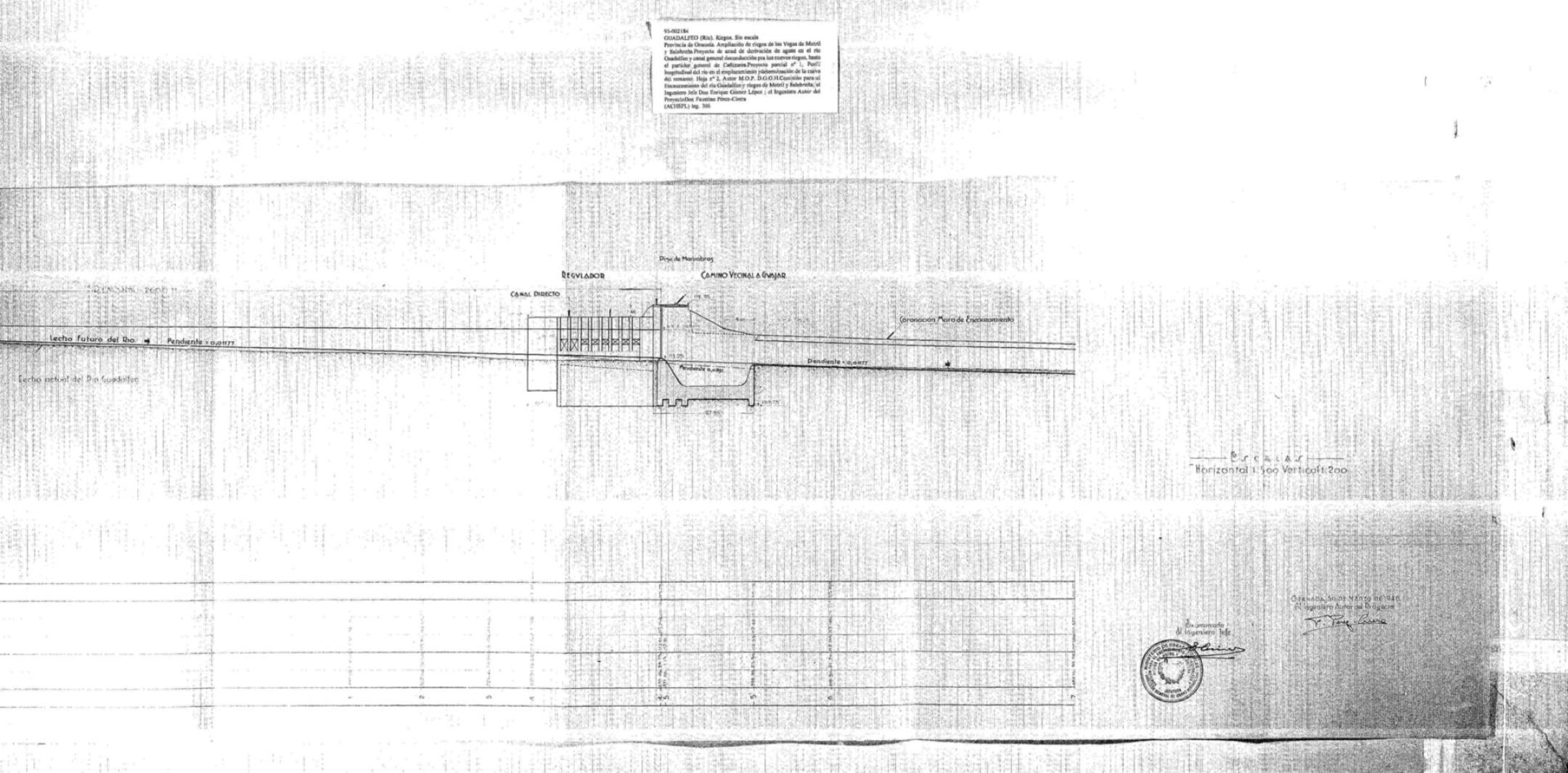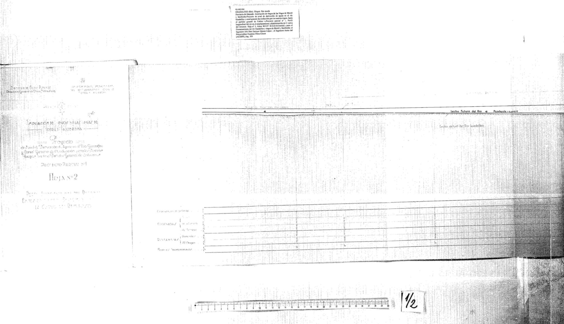 | 500 | ## | $aExpediente: Secc. 1. Leg. 306. Estante M. Tabla 1-19. M.O.P. D.G.O.H. Comisión para el encauzamiento del Río Guadalfeo y riegos de Motril y Salobreña. Ampliación de riegos en las vegas de Motril y Salobreña. Proyecto de azud de derivación de aguas en el río Guadalfeo y del canal general de conducción para los nuevos riegos, hasta el partidor General de Cañizares. Proyecto parcial nº 1. Con inclusión del puente sobre el río Guadalfeo para el camino local de Vélez Benaudalla a Guajar Faragüit solicitado por la Excma. Diputación de Granada. Ingeniero Autor del Proyecto D. Faustino Pérez-Cirera. Año 1946 | 500 | ## | $aFirmas ms. | 500 | ## | $aSe ve el río Guadalfeo, sus lechos actuales y futuro | 500 | ## | $aAparece el perfil, el nivel de máximas avenidas, el regulador, el canal directo, un piso de maniobras, el camino vecinal a Guajar y la coronación del muro de encauzamiento | 500 | ## | $aTiene el sello del M.O.P. Comisión para el encauzamiento del río Guadalfeo y Riegos de Motril y Salobreña |