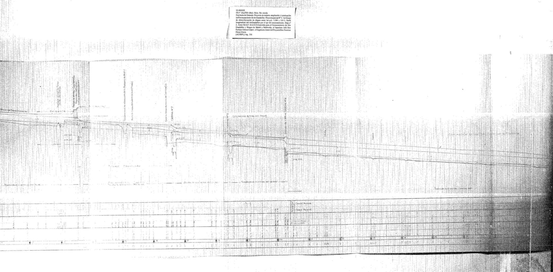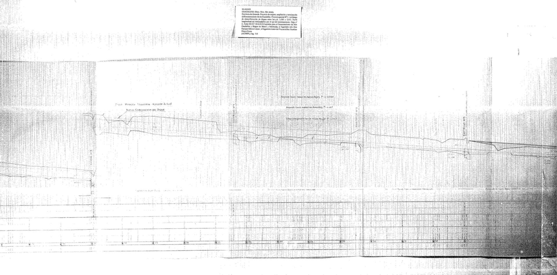 | 500 | ## | $aExpediente: Secc. 1. Leg. 316. Estante M. Tabla 1-29. M.O.P. D.G.O.H. Comisión para el encauzamiento del Río Guadalfeo y Riegos de Motril y Salobreña. Provincia de Granada. Proyecto de mejora, ampliación y terminación del Encauzamiento del río Guadalfeo. Primer grupo de obras. Proyecto parcial nº 5. Recrecimiento del dique hasta completar su elevción entre el punto kilométrico 3,300 y el puente metálico km 5,013. Ingeniero Autor del Proyecto D. Faustino Pérez-Cirera. Año 1946 | 500 | ## | $aFirmas ms. | 500 | ## | $aSe ve el mar Mediterráneo, el río Guadalfeo y el tajo de los Vados, el nivel medio del mar, la marea máxima, el fondo en diciembre de 1941, en mayo de 1943 y en julio de 1944 | 500 | ## | $aAparece el perfil, las presas de Motril y Salobreña, el origen y fin del encauzamiento, la obra actual y el replanteo definitivo, el futuro lecho del río y el nivel máximo para las riberas, diques, desagües, cadenas, canales, muros, rápidos, cauces, el camino de Sta. Ana, rastrillos, rasantes, entradas, entraderos, un puente metálico sobre el río en el C.N. 340 (a sustituir), el C.N. 340, el final del rompeolas y el nuevo puente (en construcción) | 500 | ## | $aTiene el sello del M.O.P. Comisión para el encauzamiento del Río Guadalfeo y Riegos de Motril y Salobreña |