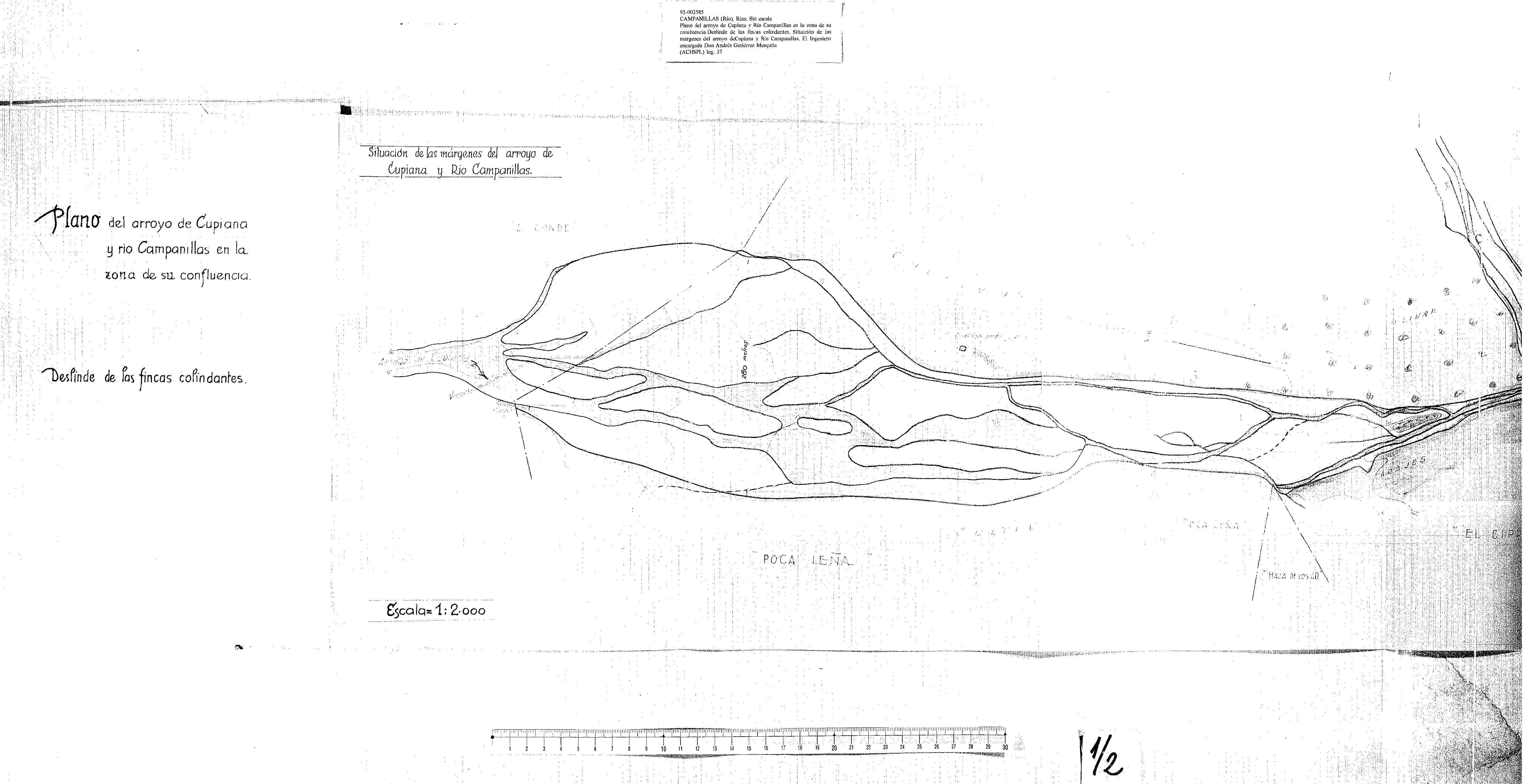 | 500 | ## | $aExpediente: Secc. 1. Leg. 37. Informe y deslinde de la Vda. de Haya. Campanillas | 500 | ## | $aFirma ms. | 500 | ## | $aN.M. orientado al W del plano | 500 | ## | $aSe ve el río Campanillas y el arroyo de Cupiana | 500 | ## | $aAparece una vereda, sotos de cañas, un olivar, cultivos, eucaliptos, una caseta de motor y pozo y las haciendas El Conde, Quintana, El Ciprés, Haza de los 40 y Poca Leña |