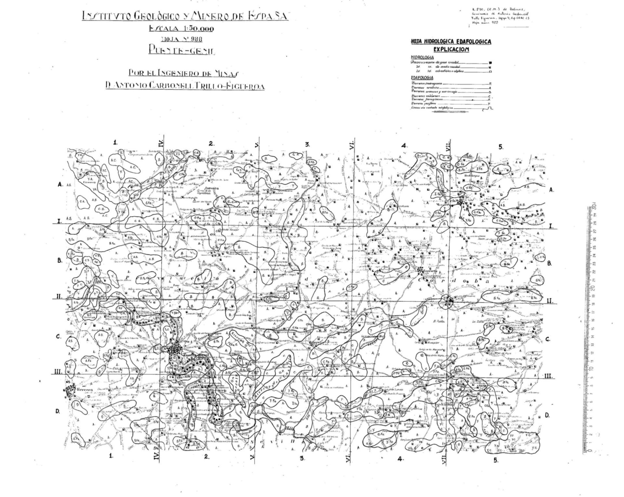 | 500 | ## | $aSobre la hoja impresa 988 del Instituto Geológico Minero de España se ha plasmado de forma manuscrita el mapa hidrológico edafológico correspondiente a esa parte del territorio | 500 | ## | $aRealizado sobre cuadrícula designada con letras y números | 500 | ## | $aSin flecha de orientación | 500 | ## | $aAparecen: los ríos Cabra, Genil, Anzur, de Lucena y de Las Yegüas, los ferrocarriles de Córdoba a Málaga y de Puente Genil a Linares, las carreteras de Monturque a Alcalá la Real, de la Estación y de la Cuesta del Espino a Málaga, arroyos como Camarata, del Pilar, del Algarrobo, de La Trampa y algunos otros, numerosos caminos, cortijos, casas, huertos, casillas, molinos, sendas, cañadas, lagares, sierras, una capilla, vértices, casillas y estaciones de ferrocarril y los núcleo urbanos de Puente Genil, Herrera, Zapateros y Monturque, carriles, las lagunas Chica y de Zóñar y la línea límite entre las provincias de Córdoba y Sevilla así como pozos y veneros, de gran y mediano caudal, algibes, terrenos arcillosos, arenosos y con cascajo, calcáreos, ferruginosos, pedregosos y yesíferos y líneas de contacto edafológico | 500 | ## | $aLa hoja comprende los términos de: Herrera, Puente Genil, Zapateros, Monturque, Lucena y Santaella | 500 | ## | $aSobre el plano se señalan en líneas marrón y con numeración romana los cortes geológicos desarrollados en otra hoja | 500 | ## | $aAngulo superior derecho con leyenda explicativa de las iniciales y signos convencionales utilizados en el mapa | 500 | ## | $aAngulo superior izquierdo con escala, número de hoja, autor y responsable de la hoja impresa que sirve de base y punto de vista geográfico: Instituto Geológico Minero de España; escala 1:50.000; Hoja núm 988; por el Ingeniero de Minas D. Antonio Carbonell Trillo-Figueroa | 500 | ## | $aJunto con una memoria y otros mapas forma el expediente ORAC 23 |