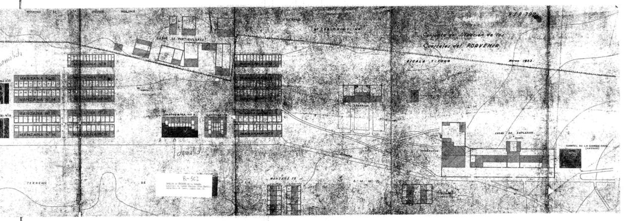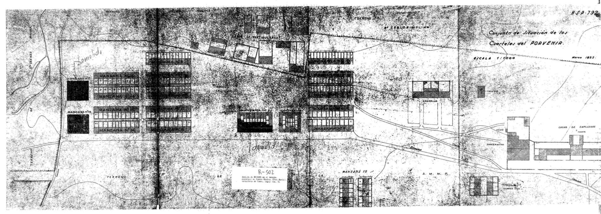| 500 | ## | $aSe trata de un plano de situación de los cuarteles del Porvenir en Fuente Obejuna | 500 | ## | $aCon flecha de orientación NV señalando al N | 500 | ## | $aAparecen: varios caminos sin denominar, casas particulares, fuentes, cuarteles de la Guardia Civil, la iglesia, escuelas, cuarteles, una cooperativa y calles | 500 | ## | $aSe anotan las manzanas demolidas | 500 | ## | $aPresenta curvas de nivel | 500 | ## | $aCon trazos discontínuos se señala el límite de los terrenos de la Sociedad | 500 | ## | $aCon el nombre de los propietarios de los terrenos que circundan el límite de la Sociedad | 500 | ## | $aSe trata de una fotocopia de un original de 1923 | 500 | ## | $aAngulo superior derecho con la signatura H-S-P 792 | 500 | ## | $aEl número de legajo ha sido dado por el catalogador |