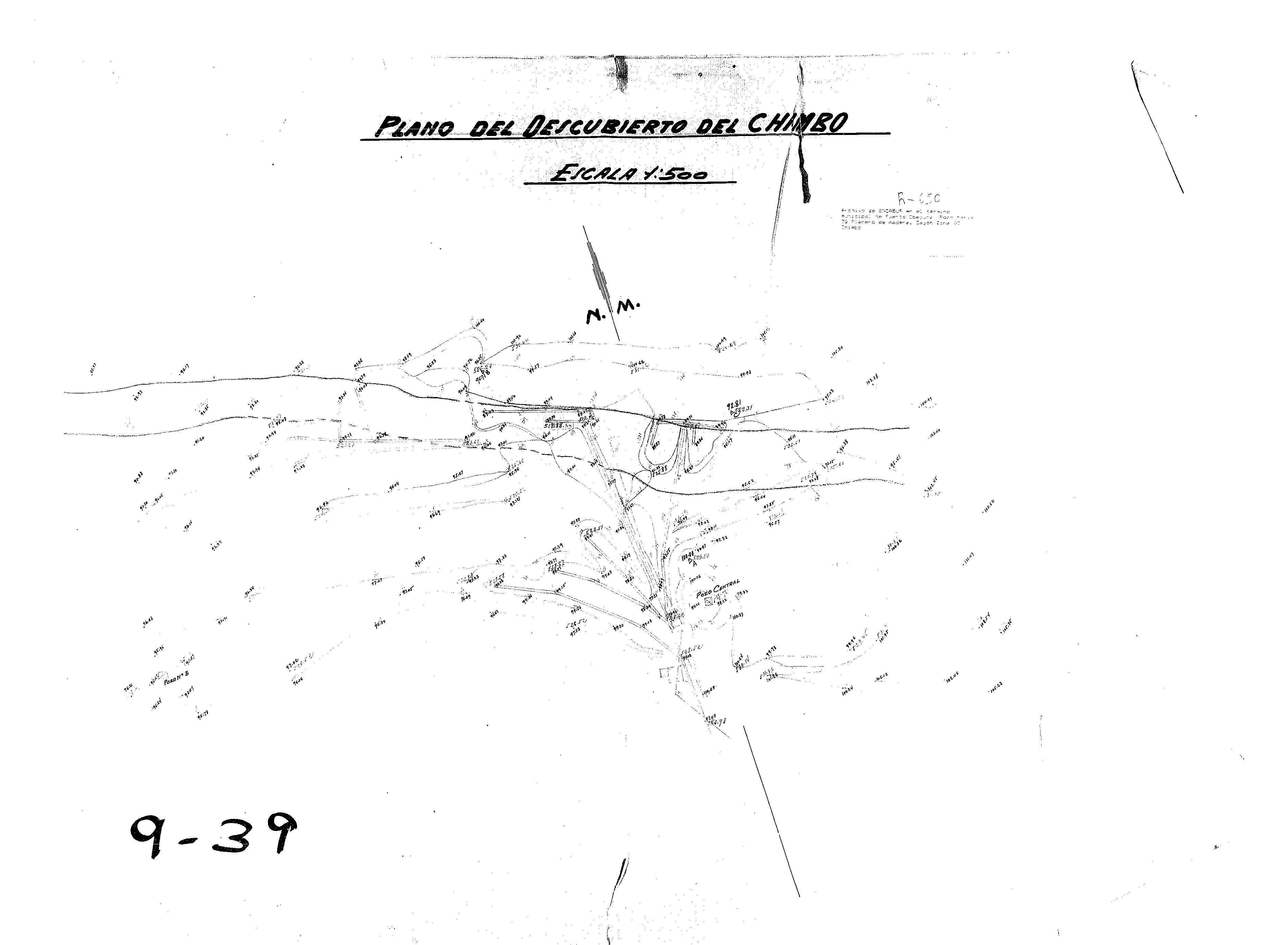 | 500 | ## | $aSe trata de un plano del descubierto de la mina El Chimbo en Peñarroya Pueblonuevo | 500 | ## | $aAtravesado por una flecha de orientación NM señalando al NW | 500 | ## | $aAparecen: un camino, numerosos puntos acotados, pozos mineros, un edificio y la zona del descubierto | 500 | ## | $aAngulo inferior izquierdo con la signatura 9-39 | 500 | ## | $aEl mapa se encuentra roto |