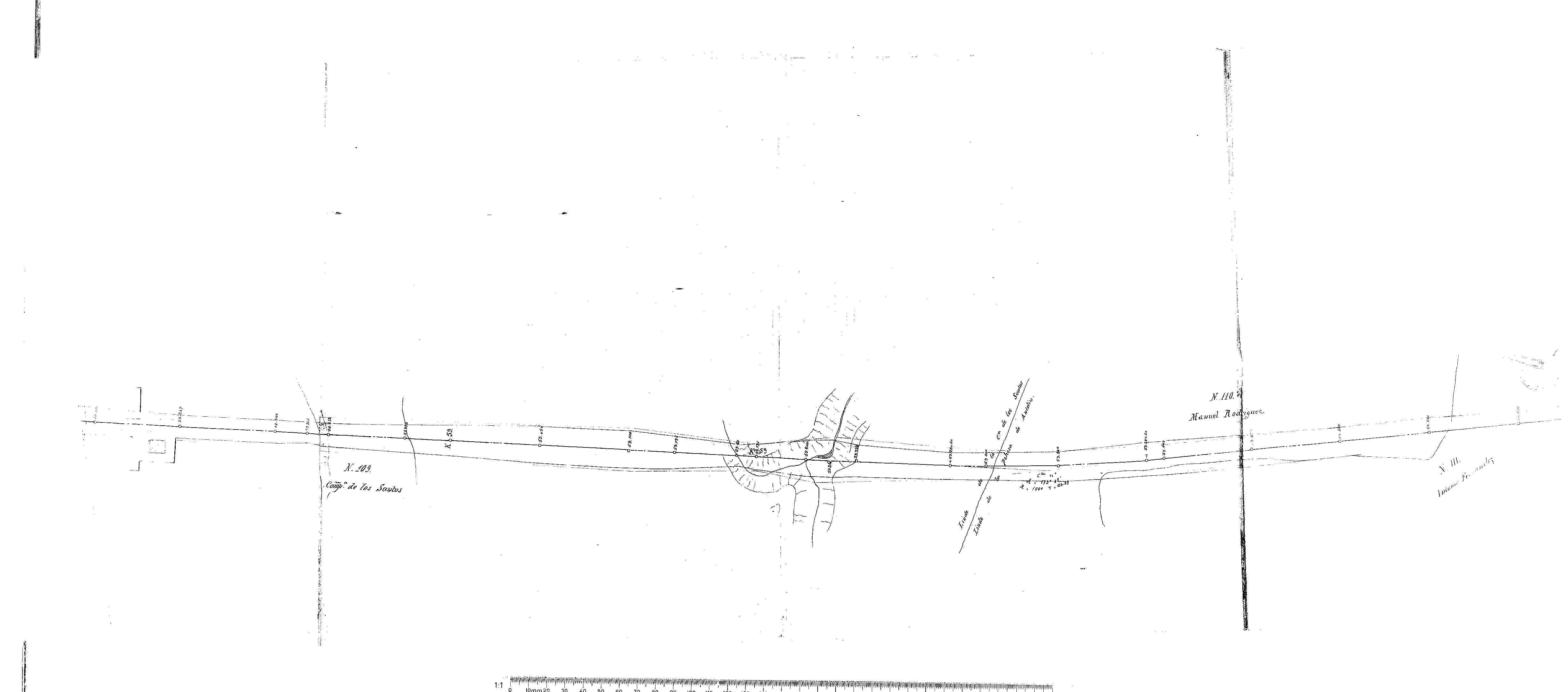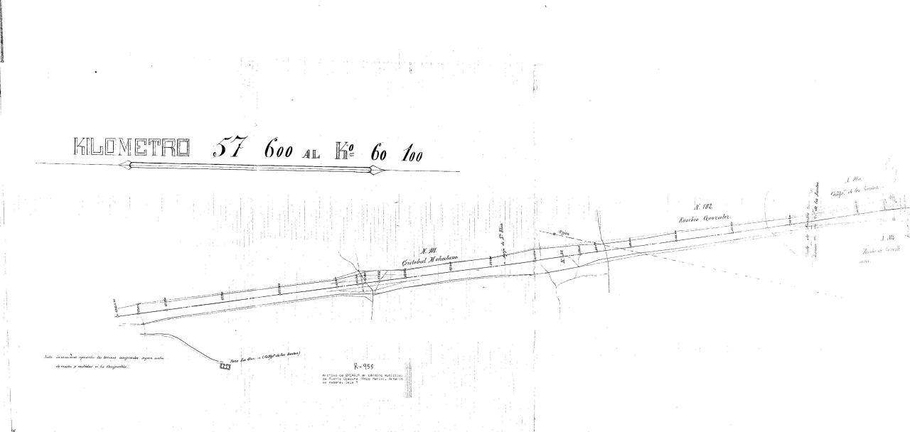 | 500 | ## | $aSe trata de un plano del trazado del ferrocarril minero a su paso por Belmez | 500 | ## | $aSin flecha de orientación | 500 | ## | $aRealizado en dos trozos | 500 | ## | $aAparecen: el pozo de la Graciosa (Cia. de los Santos), el arroyo del Salitral, diversas parcelas con el nombre de los prpietarios, la Aguja y el mojon de Santa Elisa, las lindes de la dehesa de Antolín de Belmez y del Boyar, el baldio de Realengo, radios y tangentes | 500 | ## | $aAngulo inferior izquierdo con una nota para determinar que la zona verde responde a los terrenos comprados, escriturados y cedidos a la Compañía | 500 | ## | $aPor detrás presenta el nº de Reg. 25/30 | 500 | ## | $aEl número de la caja ha sido dado por los catalogadores |