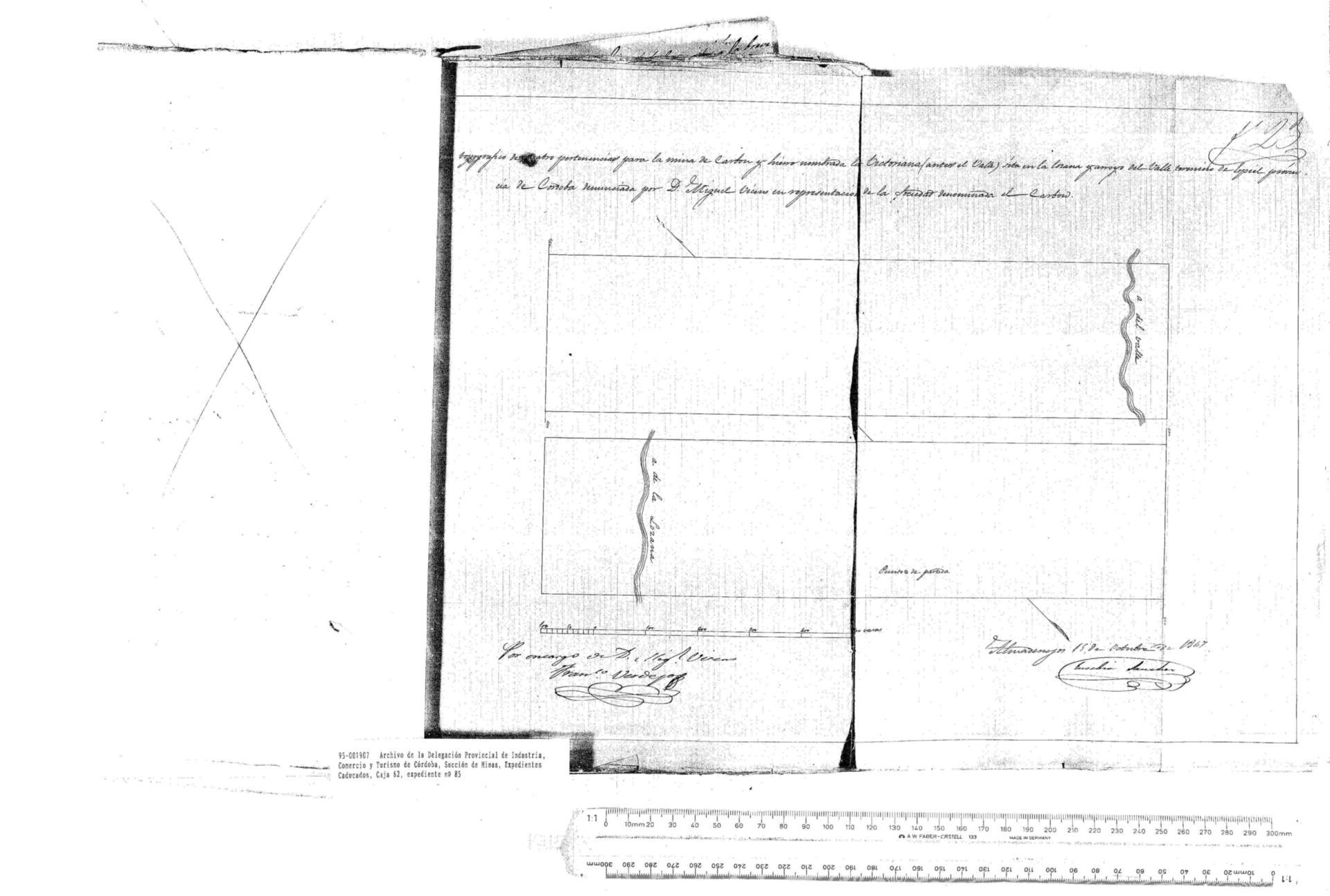 | 500 | ## | $aSe trata de un plano de demarcación de 4 pertenencias | 500 | ## | $aCon una flecha de orientación NM señalando al NW | 500 | ## | $aAparecen: arroyos del Valle y de La Lozana | 500 | ## | $aAngulo inferior izquierdo con expresión de escala gráfica de 11,6 cm = 500 varas | 500 | ## | $aAngulo inferior derecho: Almadenejos 15 de Octubre de 1.847, fdo. Eusebio Sánchez | 500 | ## | $aCosido dentro de un expediente | 500 | ## | $aHoja numerada | 500 | ## | $aExiste otra copia del plano adjunta en el mismo expediente | 500 | ## | $aAngulo inferior izquierdo con una nota firmada por Francisco Verdugo |