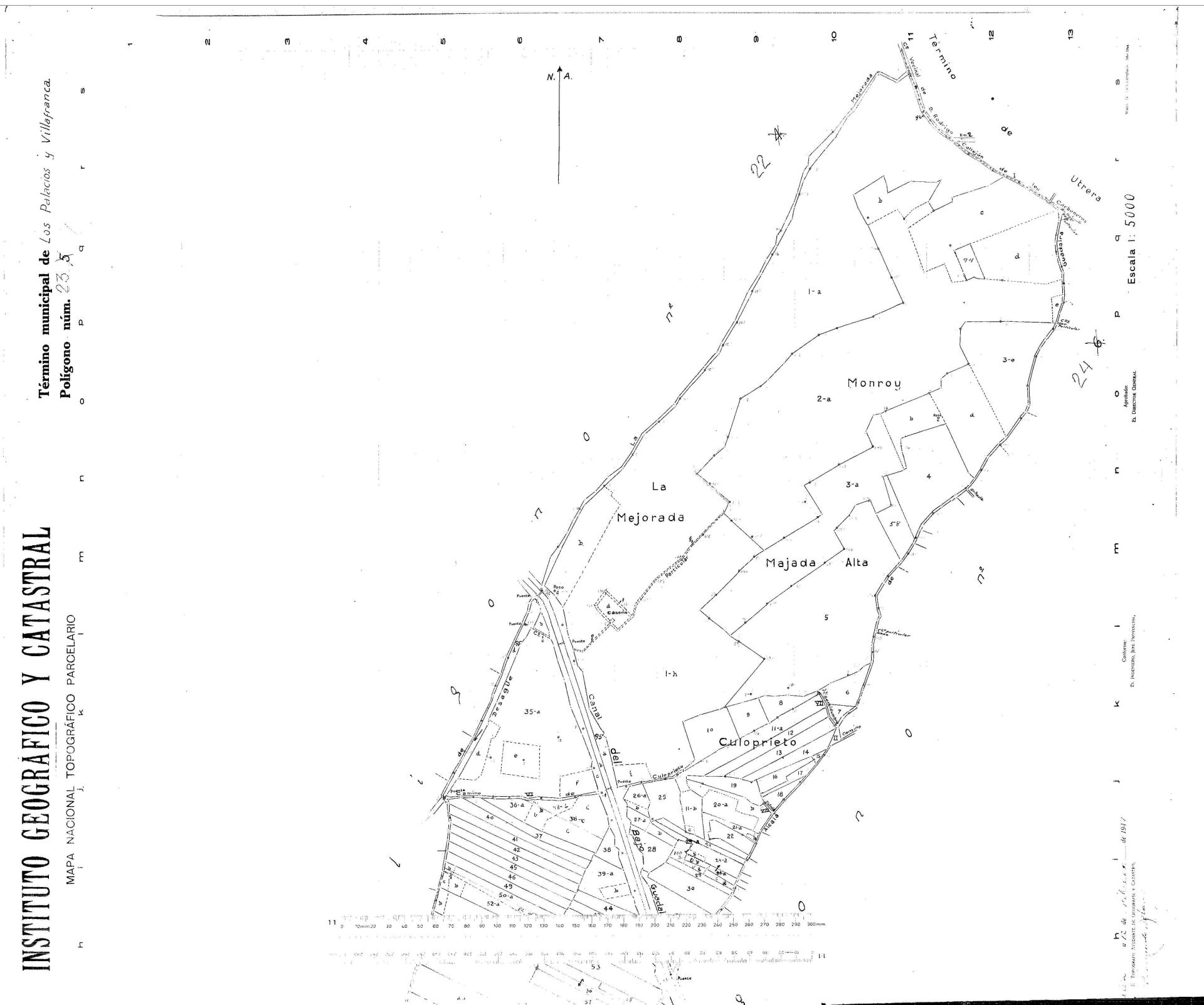 | 500 | ## | $aImpreso parte del título y cuadriculación | 500 | ## | $aImpresas diversas antefirmas con especificación de los responsables del documento, firma ilegible del Desarrollador-Revisor | 500 | ## | $aOrientado al E del plano | 500 | ## | $aPolígono dividido en parcelas y zonas delimitadas: Monroy, La Mejorada, Majada Alta, Culoprieto, Alcornocal y Ratones; señala caminos, carreteras, caseríos y canal del Bajo Guadalquivir; linda con los polígonos 21, 22, 25 y 24 | 500 | ## | $aExiste otro original en papel vegetal |