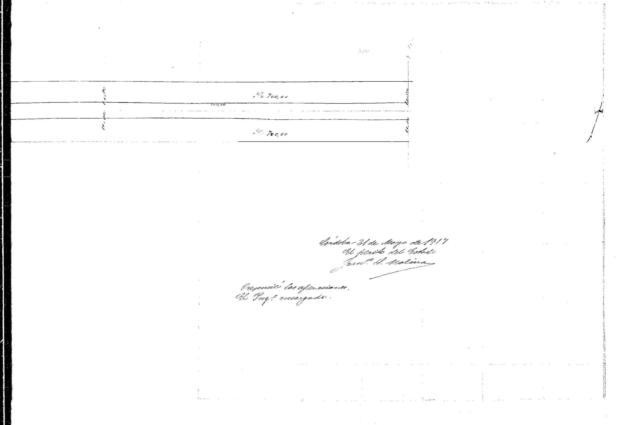 | 500 | ## | $aSe trata de un plano parcelario de los terrenos a expropiar para la construcción del trozo 4o de la carretera de Córdoba a Palma del Río | 500 | ## | $aRealizado en dos secciones debido a la falta de espacio | 500 | ## | $aSin flecha de orientación | 500 | ## | $aAparece: linderos, baldío, cerca, camino, arroyo Emparedada, puente y la carretera en proyecto | 500 | ## | $aEn el trazado encontramos numerosas medidas y anotaciones | 500 | ## | $aEncontramos las parcelas a expropiar numeradas, con el nombre de sus propietarios y superficie ocupada | 500 | ## | $aAngulo inferior derecho con lugar, fecha y firma: Córdoba 31 de Mayo de 1917; fdo. el Perito del Estado Francisco S Molina; presenció las operaciones el Ingeniero Encargado (sin firma) | 500 | ## | $aNota con el título en el reverso de la hoja | 500 | ## | $aPresenta adjunto el expediente |