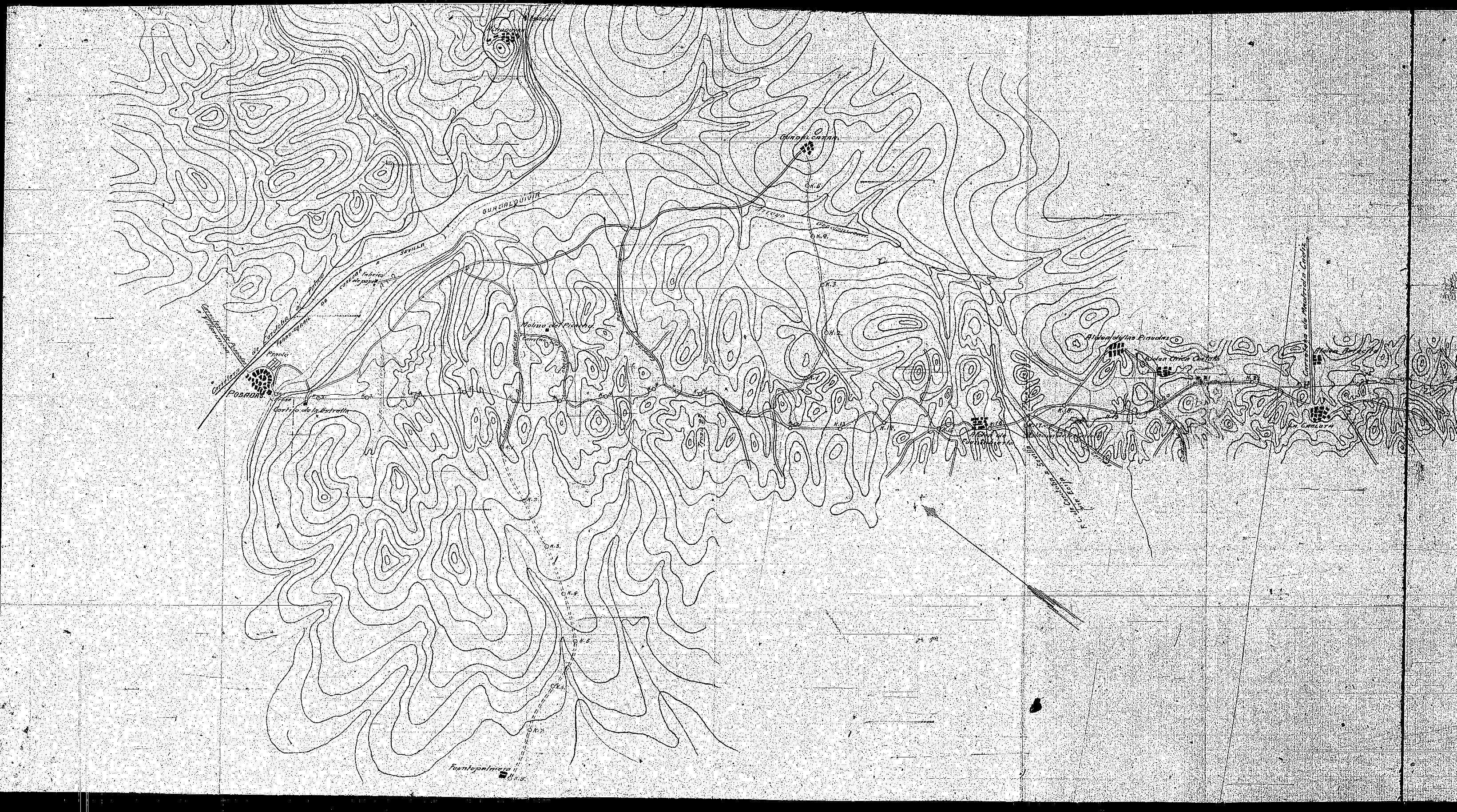 | 500 | ## | $aSe trata de un plano general del trazado de la carretera de Posadas a La Rambla | 500 | ## | $aCon una flecha de orientación NM señalando al NW | 500 | ## | $aAparece: la carretera de Posadas a Villaviciosa, carretera de Córdoba a Palma, línea de ferrocarril de Córdoba a Sevilla, presa, cortijo de La Estrella, prado, río Guadalquivir, fábrica de papel, camino a Almodóvar, molino del Picacho, camino del Picacho, camino a Posadas, arroyo Vacia Colmillos, regajos, estación, arroyo Guadamazón, estación de La Carlota, camino a La Carlota, camino a Ecija, carretera de Madrid a Cádiz, camino a Rinconcillo, camino a San Sebastián de los Ballesteros, núcleos urbanos de Posadas, Fuente Palmera, Almodóvar, Guadalcázar, La Carlota, San Sebastián de los Ballesteros, La Rambla, Fuencubierta, Las Pinedas, Chica Carlota y Arrecife, camino de La Rambla y la carretera en proyecto | 500 | ## | $aAngulo inferior derecho con lugar, fecha y firma: Córdoba 2 de Agosto de 1919; fdo. el Ingeniero autor del Proyecto Carlos Quero; examinado del Ingeniero Jefe (sin firma) | 500 | ## | $aPresenta adjunto el expediente | 500 | ## | $aAdherida una hoja a modo de portada con el título y número de anejo |