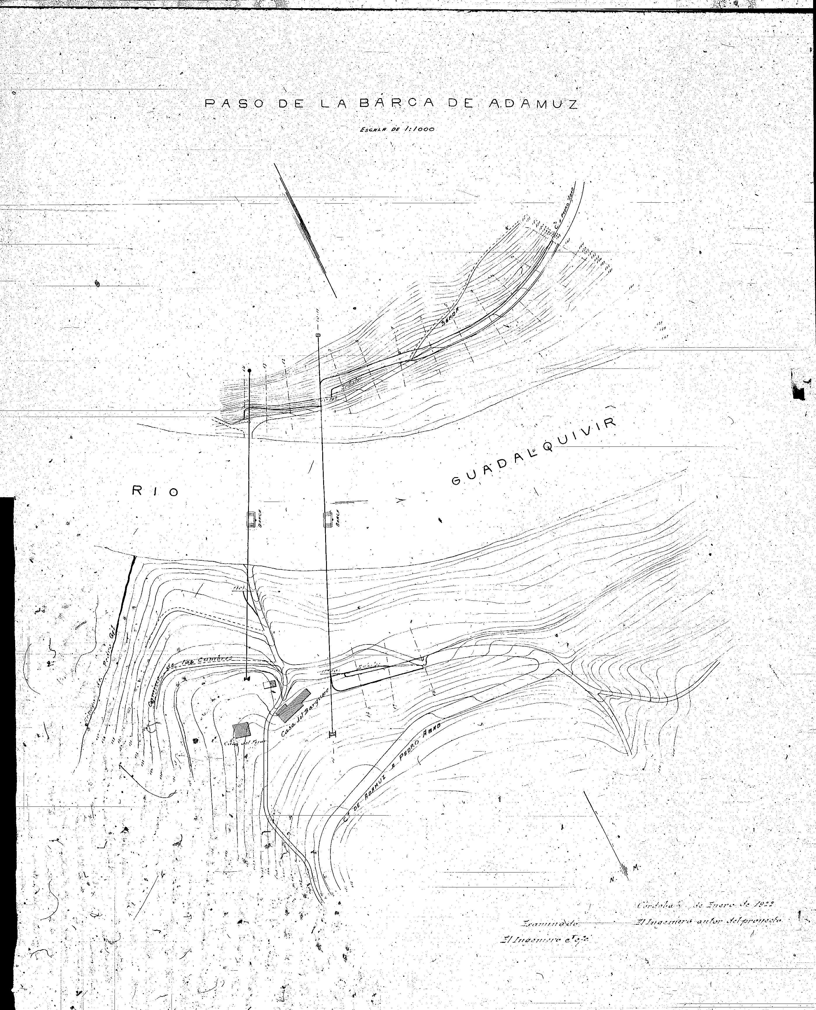 | 500 | ## | $aSe trata de un plano general del trazado del paso de la barca de Adamuz | 500 | ## | $aAtravesado por una flecha de orientación NM señalando al SE | 500 | ## | $aAparece: el río Guadalquivir, carretera de Adamuz a Pedro Abad, arroyo de Pedro Gil, camino de Las Cumbres, casa del Tejar, casa del Barquero, embalse, senda y barcas | 500 | ## | $aCon curvas de nivel equidistantes 1 metros | 500 | ## | $aLa dirección del cauce del río viene marcada por una flecha | 500 | ## | $aEn el trazado hay varios perfiles transversales desarrollados en otras hojas | 500 | ## | $aAngulo inferior derecho con lugar, fecha y firma: Córdoba 24 de Enero de 1922; fdo. el Ingeniero autor del Proyecto M Rodríguez; examinado del Ingeniero Jefe (ilegible) y sello en tinta de Obras Públicas, Provincia de Córdoba | 500 | ## | $aPresenta adjunto el expediente | 500 | ## | $aAdherida una hoja a modo de portada con el título y número de hoja |