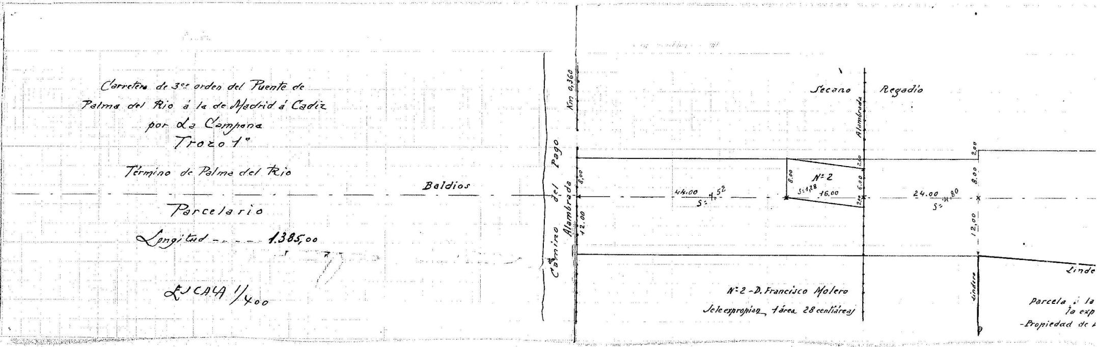 | 500 | ## | $aSe trata de un plano parcelario de los terrenos a expropiar para la construcción del trozo 1o de la carretera de Palma del Río a la de Madrid a Cádiz | 500 | ## | $aSin flecha de orientación | 500 | ## | $aAparece: camino del Pago, alambrada, linderos, río Genil, descansadero del cordel o camino, casas, huertas, valdíos, camino y la carretera en proyecto | 500 | ## | $aEn el trazado encontramos numerosas medidas y anotaciones | 500 | ## | $aEncontramos las parcelas a expropiar numeradas, con el nombre de sus propietarios, cultivo y superficie ocupada | 500 | ## | $aAngulo inferior derecho con lugar, fecha y firma: Córdoba 11 de Septiembre de 1929; fdo. el Perito del Estado Antonio G Aguado; el Perito de los Propietarios José Guerra Lozano y presenció el Ingeniero Encargado R Blasco Perea | 500 | ## | $aPresenta adjunto el expediente | 500 | ## | $aEl mapa se encuentra roto |