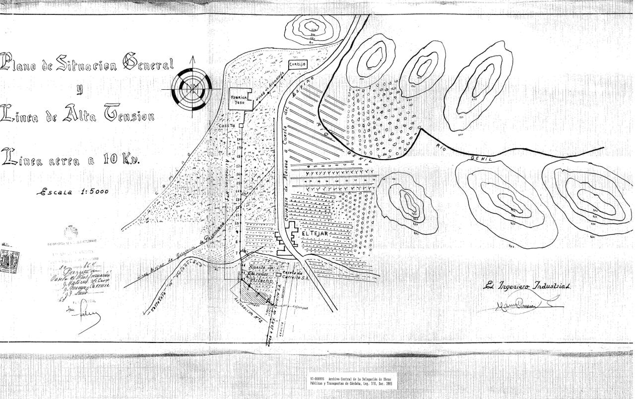 | 500 | ## | $aCon flecha de orientación NM señalando al N | 500 | ## | $aAparece: la carretera de Málaga a Cuesta del Espino, camino, carretera de Palenciana a El Tejar, río Genil, aldea El Tejar, fábrica de yeso, cortijo, línea de teléfonos a Palenciana, caseta, línea de alumbrado, huerta de Don Salvador Artacho, entronque y línea a 10 KV en proyecto | 500 | ## | $aCon curvas de nivel equidistantes 20 metros | 500 | ## | $aInscrito en un recuadro | 500 | ## | $aAngulo inferior izquierdo con sello en tinta de legalización de documentos fechado en Julio de 1963 y con firma ilegible del Delegado | 500 | ## | $aAngulo inferior derecho con la firma del Ingeniero Industrial Manuel Carreira | 500 | ## | $aSin lugar, ni fecha | 500 | ## | $aFecha tomada del expediente | 500 | ## | $aPresenta adjunto el expediente |