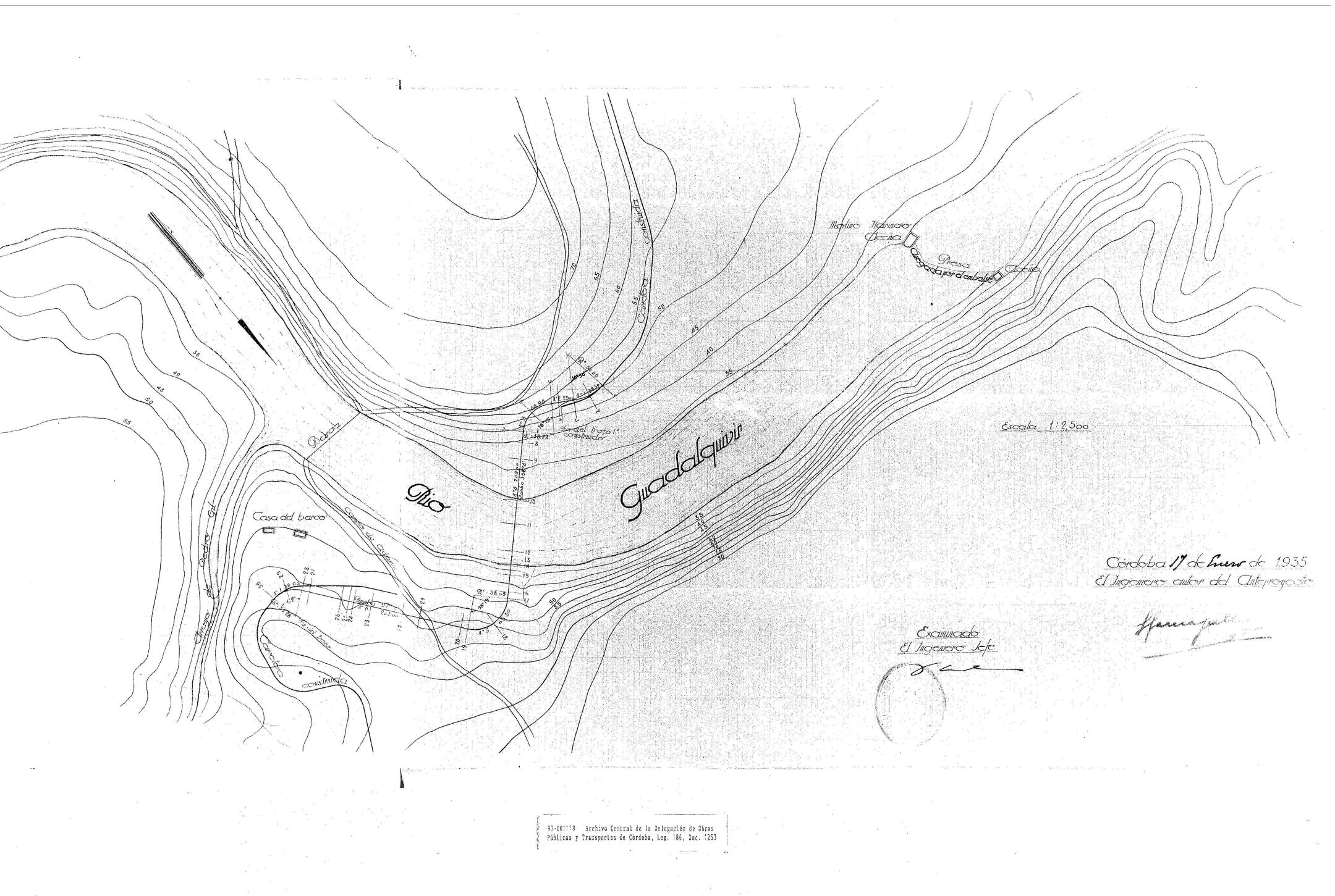| 500 | ## | $aCon una flecha de orientación señalando al SE | 500 | ## | $aAparece: el río Guadalquivir, arroyo de Pedro Gil, carretera construida, camino de Adamuz, barca, molino harinero, aceñas, presas, casa del barco y puente en proyecto | 500 | ## | $aCon curvas de nivel equidistantes 5 metros | 500 | ## | $aEn el trazado encontramos numerosas medidas y perfiles transversales | 500 | ## | $aAngulo inferior derecho con lugar, fecha y firma: Córdoba, 17 de Enero de 1935; fdo. el Ingeniero autor del proyecto S García Gallego; examinado del Ingeniero Jefe (ilegible) y sello en tinta de Obras Públicas, Provincia de Córdoba | 500 | ## | $aAdherida una hoja a modo de portada con el título y número de hoja | 500 | ## | $aPresenta adjunto el expediente |