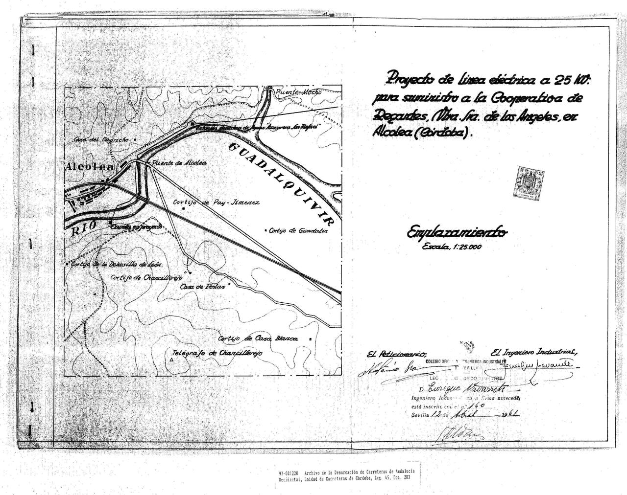 | 500 | ## | $aSin flecha de orientación | 500 | ## | $aAparece: barriada de Alcoléa, río Guadalquivir, casa del Capricho, puente Mocho, estación elevadora de aguas "Azucarera San Rafael", puente de Alcoléa, cortijos, casas y la caseta en proyecto desde donde parte la línea hacia la estación elevadora de aguas | 500 | ## | $aCon curvas de nivel | 500 | ## | $aMargen derecho con una póliza | 500 | ## | $aAngulo inferior derecho con la firma del Ingeniero Industrial Enrique Navarrete; del peticionario (ilegible) y sello en tinta de autentificación del Colegio Oficial de Ingenieros Industriales de Sevilla y fechado el 12 de Abril de 1961 | 500 | ## | $aSin lugar, ni fecha, ni firmas | 500 | ## | $aFecha tomada del expediente | 500 | ## | $aPresenta adherida una hoja a modo de portada con el título | 500 | ## | $aPresenta adjunto el expediente |