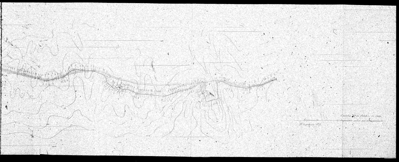 | 500 | ## | $aSin flecha de orientación | 500 | ## | $aAparece: arroyo de Las Cañas, barranco de La Herradura y arroyo del Bugillo y la carretera en proyecto | 500 | ## | $aCon curvas de nivel equidistantes 5 metros | 500 | ## | $aEn el trazado encontramos numerosas medidas, distancias kilométricas y perfiles transversales numerados y desarrollados en otras hojas | 500 | ## | $aAngulo inferior derecho con lugar, fecha y firma: Córdoba, 20 de Octubre de 1910; fdo. el Ingeniero autor del proyecto F Ramírez Doreste; examinado del Ingeniero Jefe Tejada | 500 | ## | $aAdherida una hoja a modo de portada con el título y número de hoja | 500 | ## | $aPresenta adjunto el expediente | 500 | ## | $aFormado por dos pliegos de papel pegados entre sí |