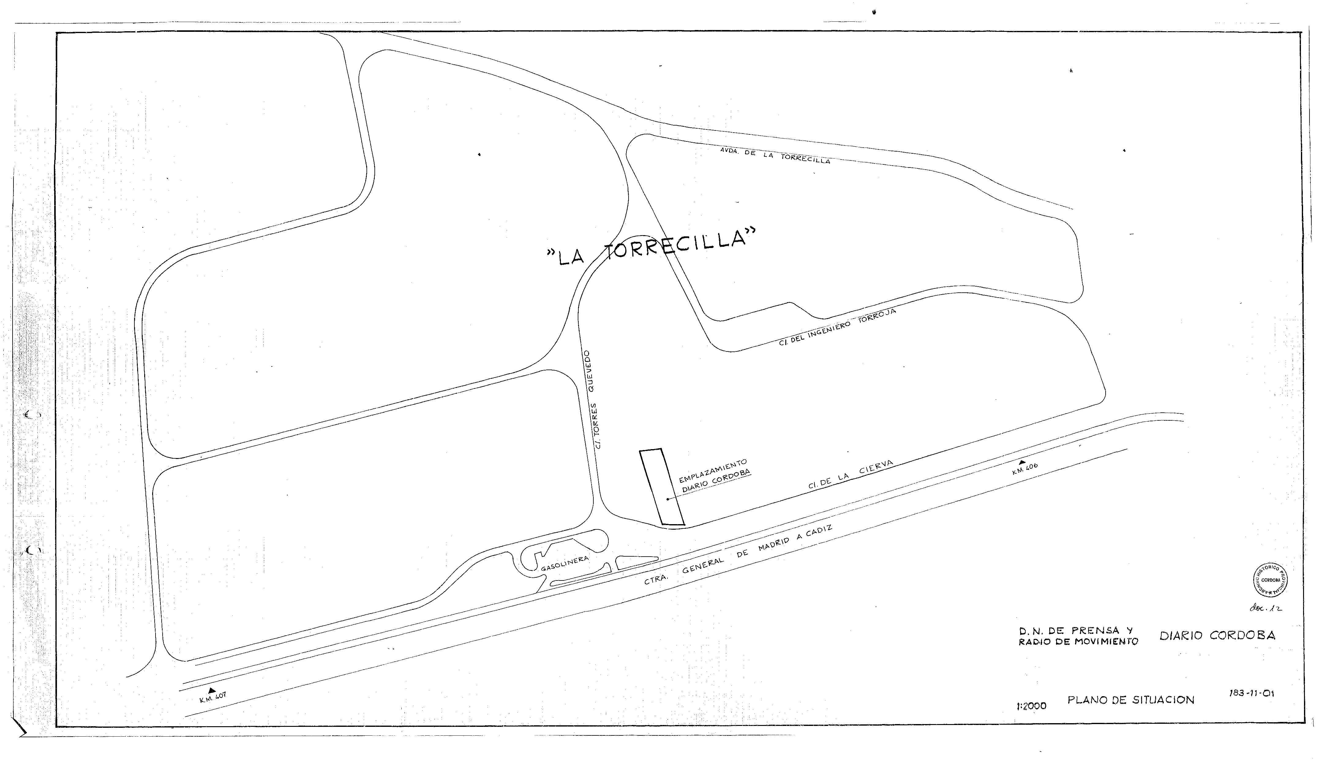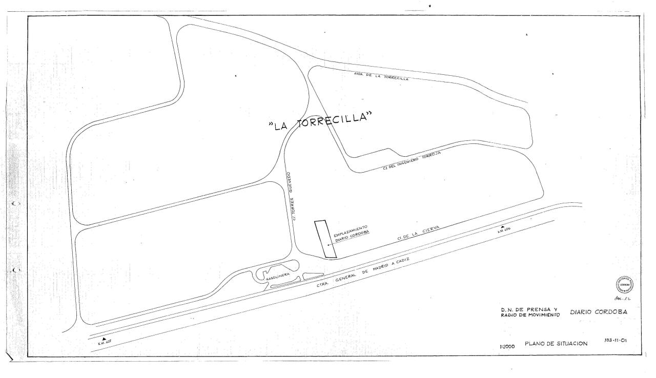 | 500 | ## | $aSe representa el emplazamiento del Diario Córdoba en el Polígono de La Torrecilla en Córdoba | 500 | ## | $aInscrito en un recuadro | 500 | ## | $aSin flecha de orientación | 500 | ## | $aAparecen: la avenida de La Torrecilla, el edificio del Diario, una gasolinera, las calles de Torres Quevedo, del Ingeniero Torroja y de La Cierva, así como la carretera general de Madrid a Cádiz en el tramo de los kilómetros 406 al 407 | 500 | ## | $aAngulo inferior derecho con el título, escala y empresa, así como el sello del Archivo Histórico Provincial de Córdoba, documento 12 |