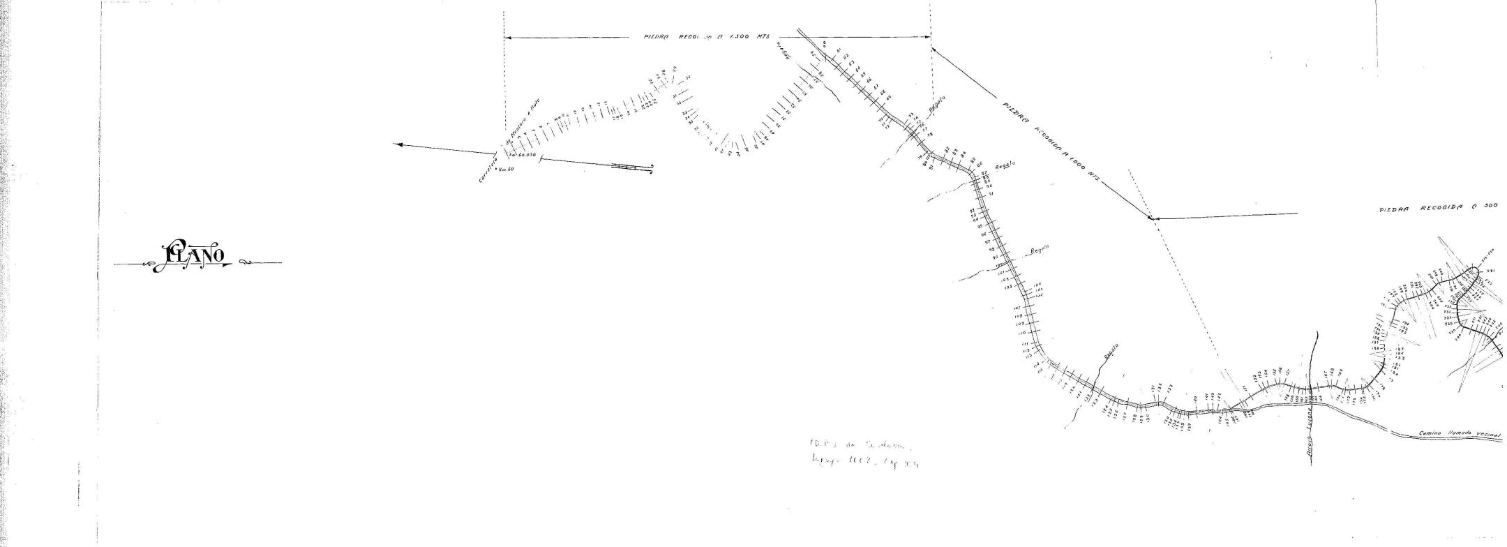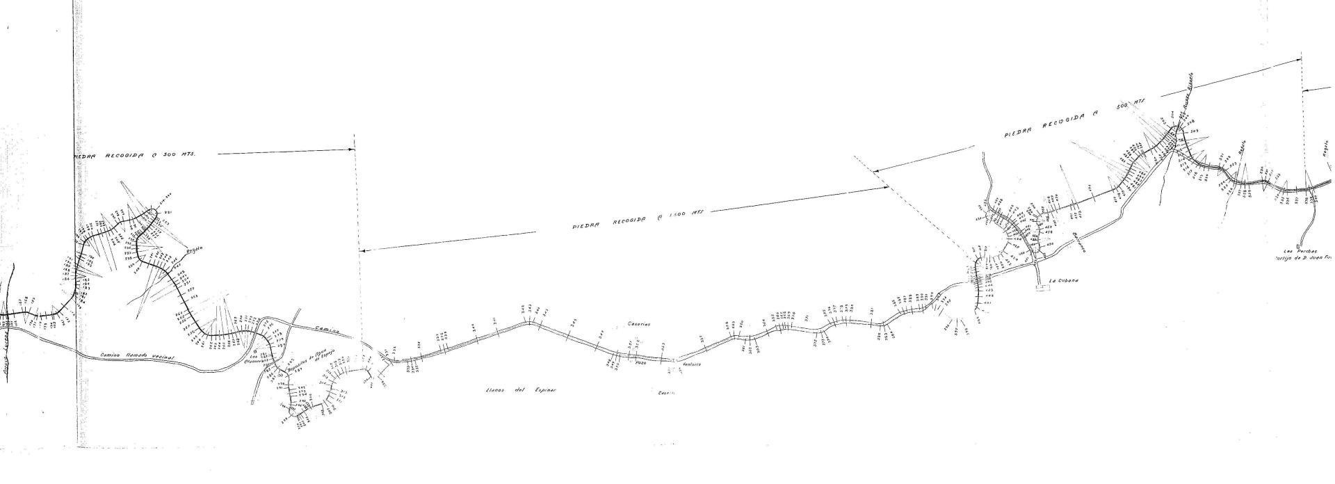 | 500 | ## | $aSe trata de un plano del trazado del camino vecinal de la carretera de Montoro a Rute al Ventorro de Lagunillas | 500 | ## | $aCon una flecha de orientación señalando al W | 500 | ## | $aAparece: la carretera de Montoro a Rute, regajos, el arroyo Lucena, camino vecinal, el cortijo Los Atanores, depósitos de agua de Espejo, caserios, ventorro, pozo, Llanos del Espinar, cortijo La Cubana, barranco, arroyo Rihuelo, cortijo Las Perchas, carril a la carretera de Montilla, ventorro de Lagunillas, zonas de extracción del material, canteras y camino vecinal en proyecto | 500 | ## | $aA lo largo del trazado encontramos perfiles transversales numerados | 500 | ## | $aSe señala el tipo de material a extraer y la distancia de la zona de extracción al camino | 500 | ## | $aAngulo inferior derecho con lugar, fecha y firmas: Córdoba 12 de Junio de 1930; fdo. el Ingeniero autor del proyecto J M Peñasco; examinado y conformado por el Ingeniero Director Jiménez de la Cruz y sello en tinta de la Diputación Provincial de Córdoba, Vías y Obras |